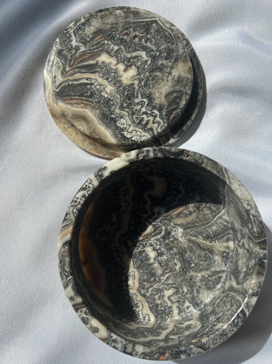“Beholden” Onyx & Calcite Bowl/ Container with Lid