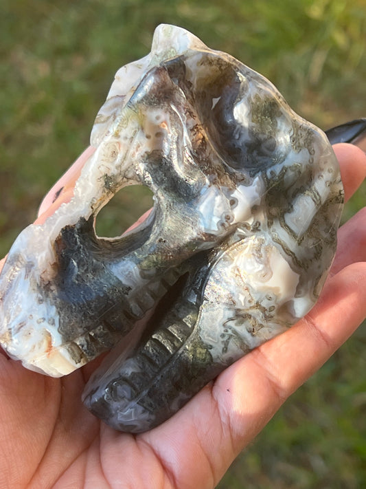 “Moss-asaurus” Druzy Moss Agate Dino Skull