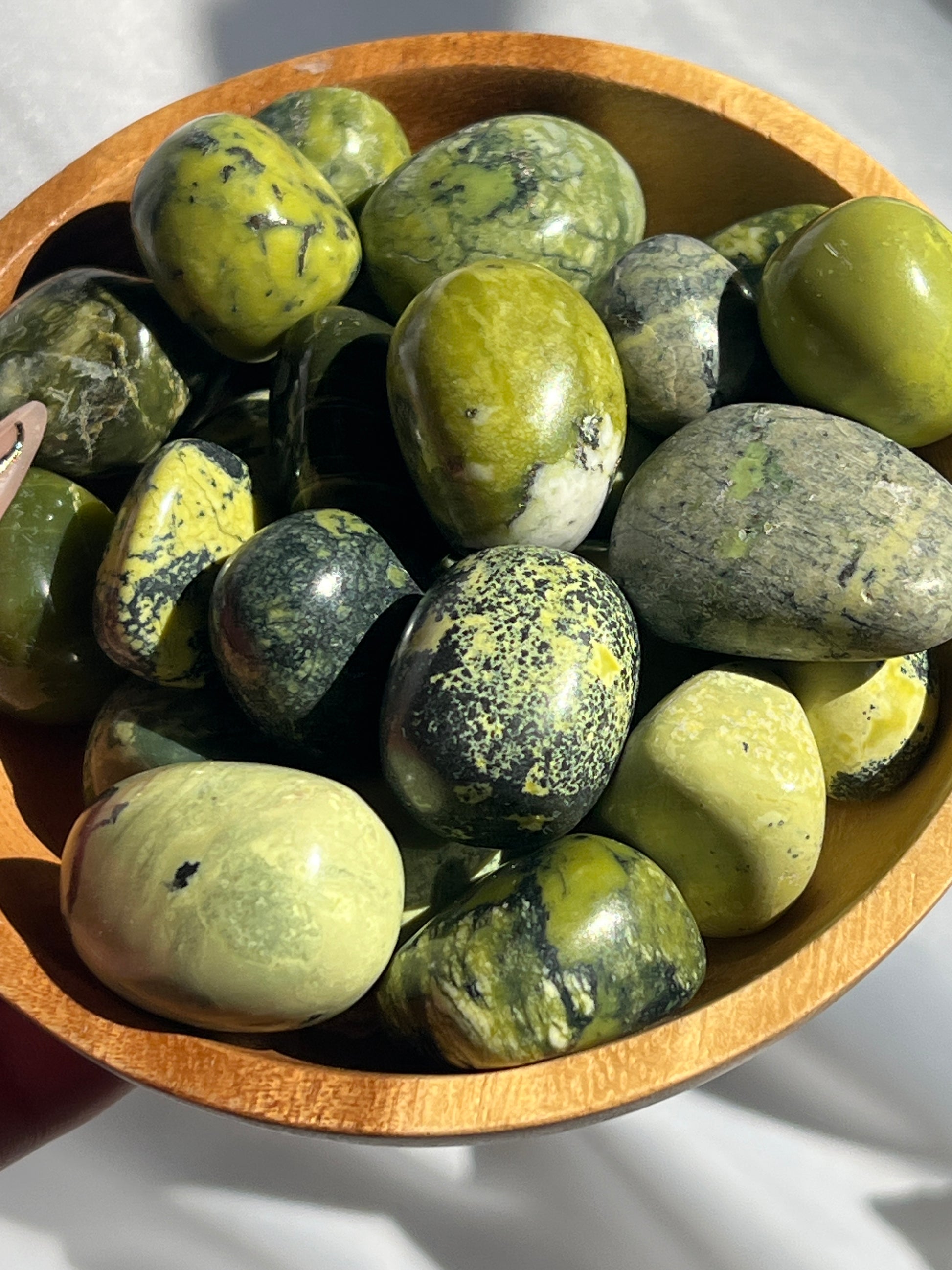 Gorgeous variations of green pop from smooth Serpentine tumbles. Some even include Pyrite!