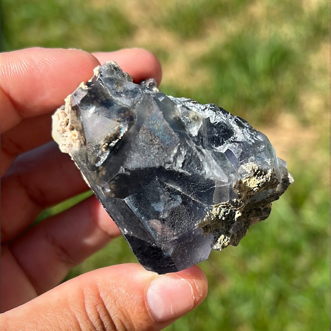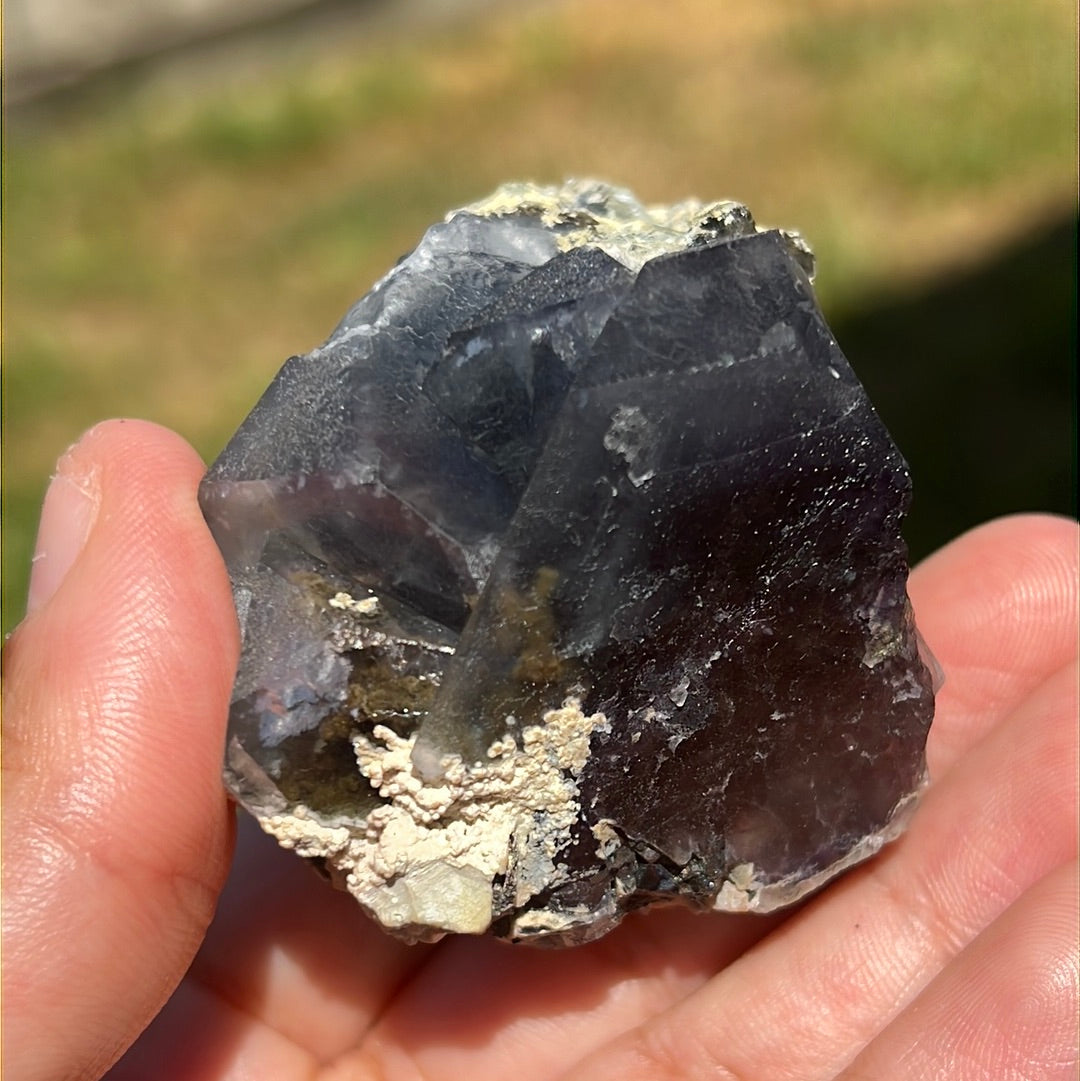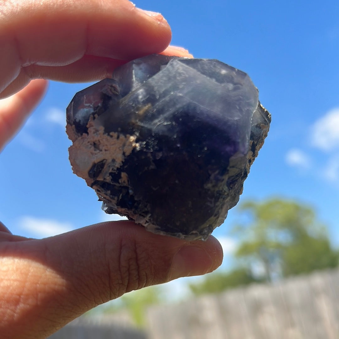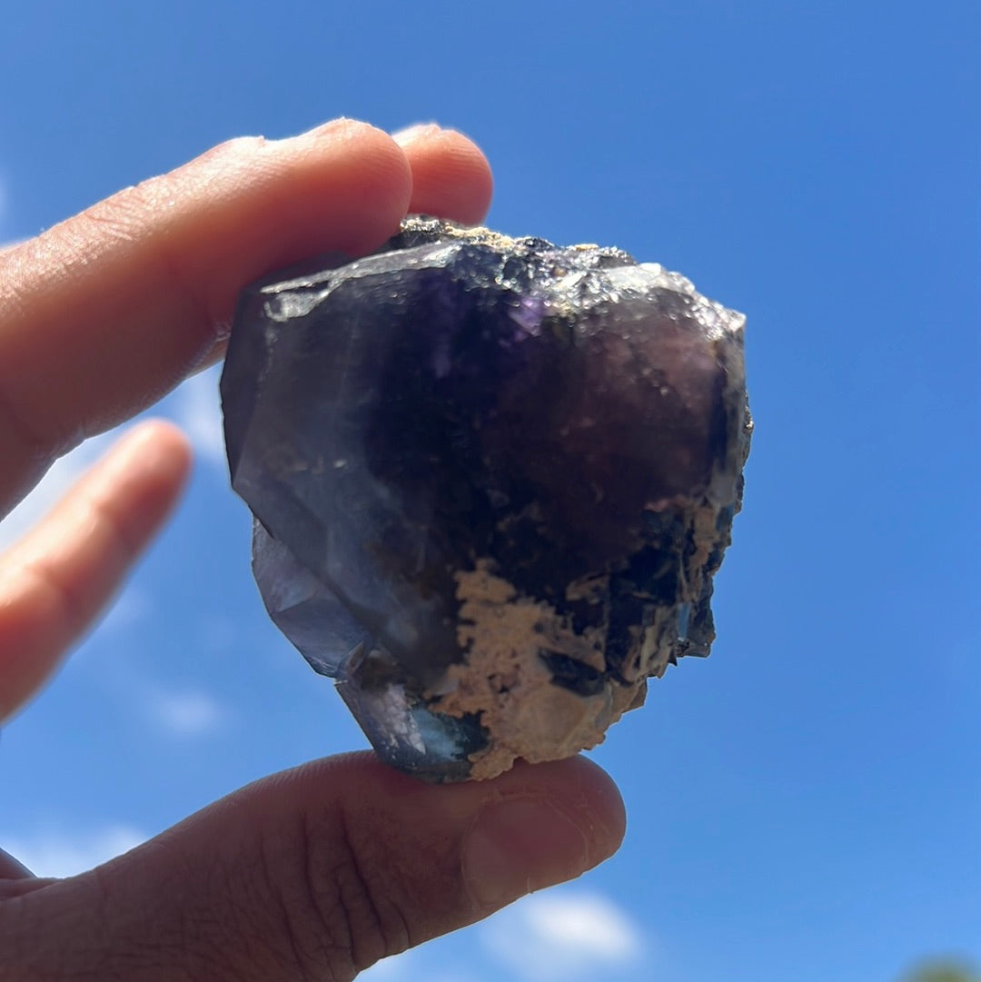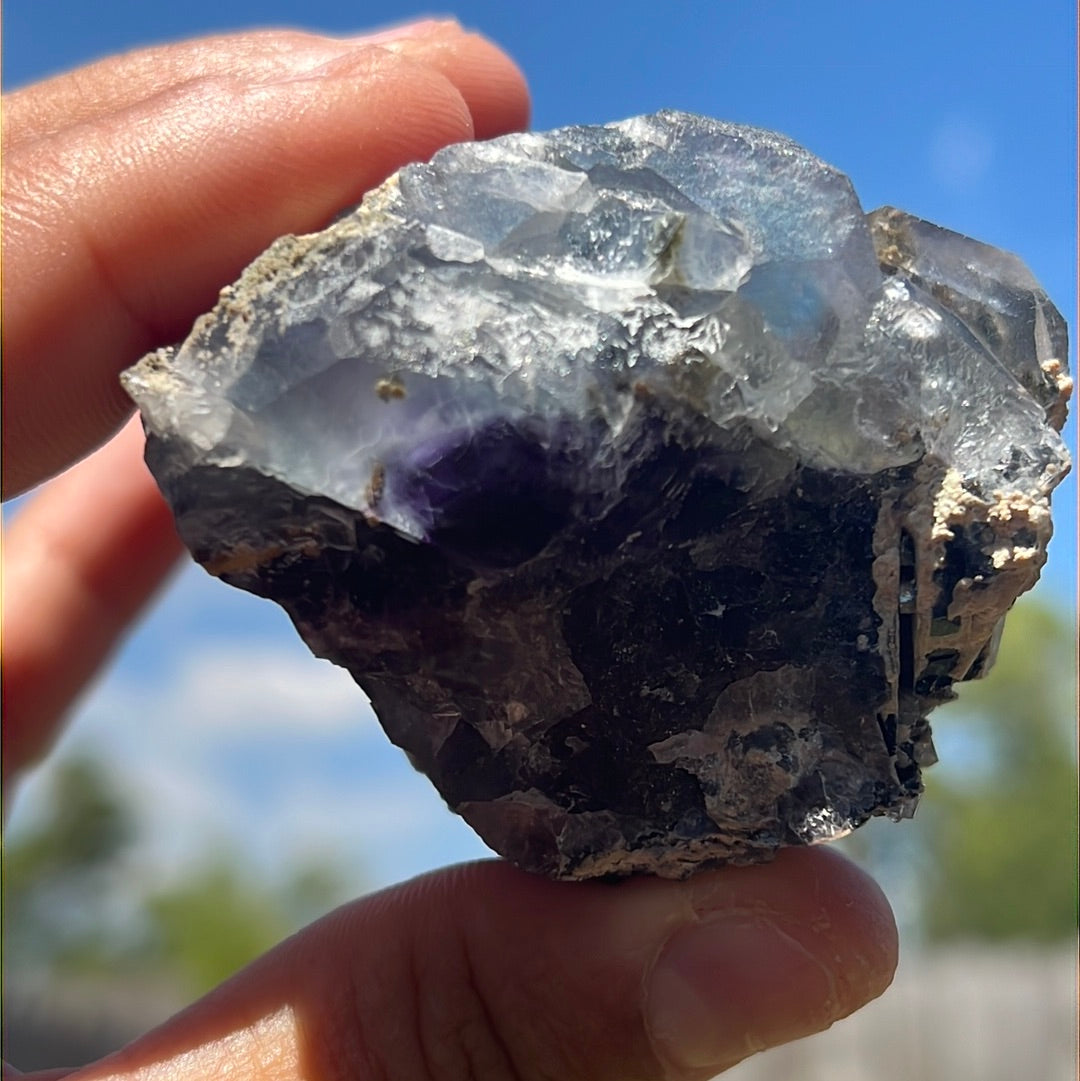 A beautiful unique blue and purple cluster with a special formation and what appears to be pink phantom or red core fluorite!