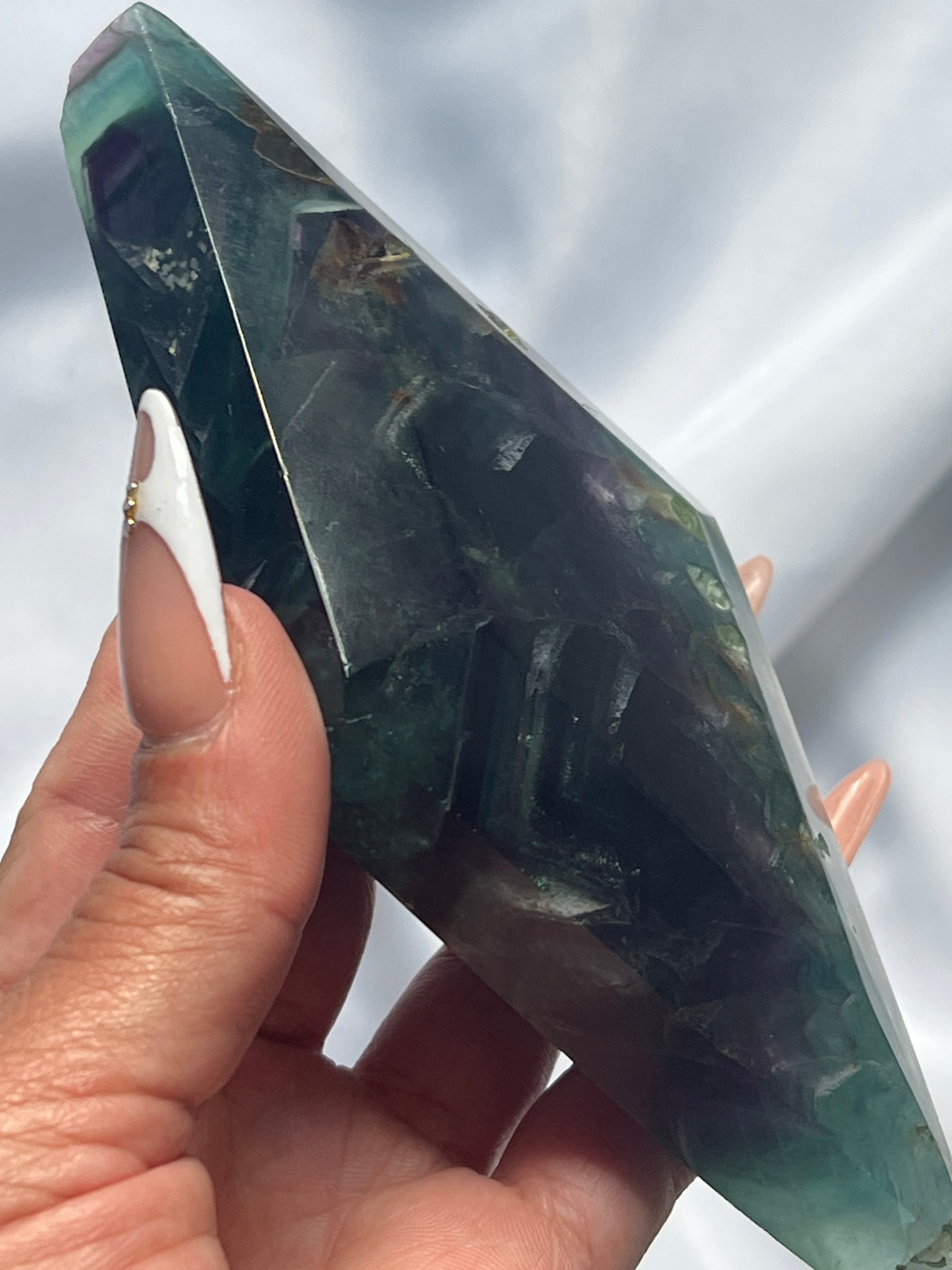 “Diamond in the Rough” Rainbow Feather Fluorite Diamond