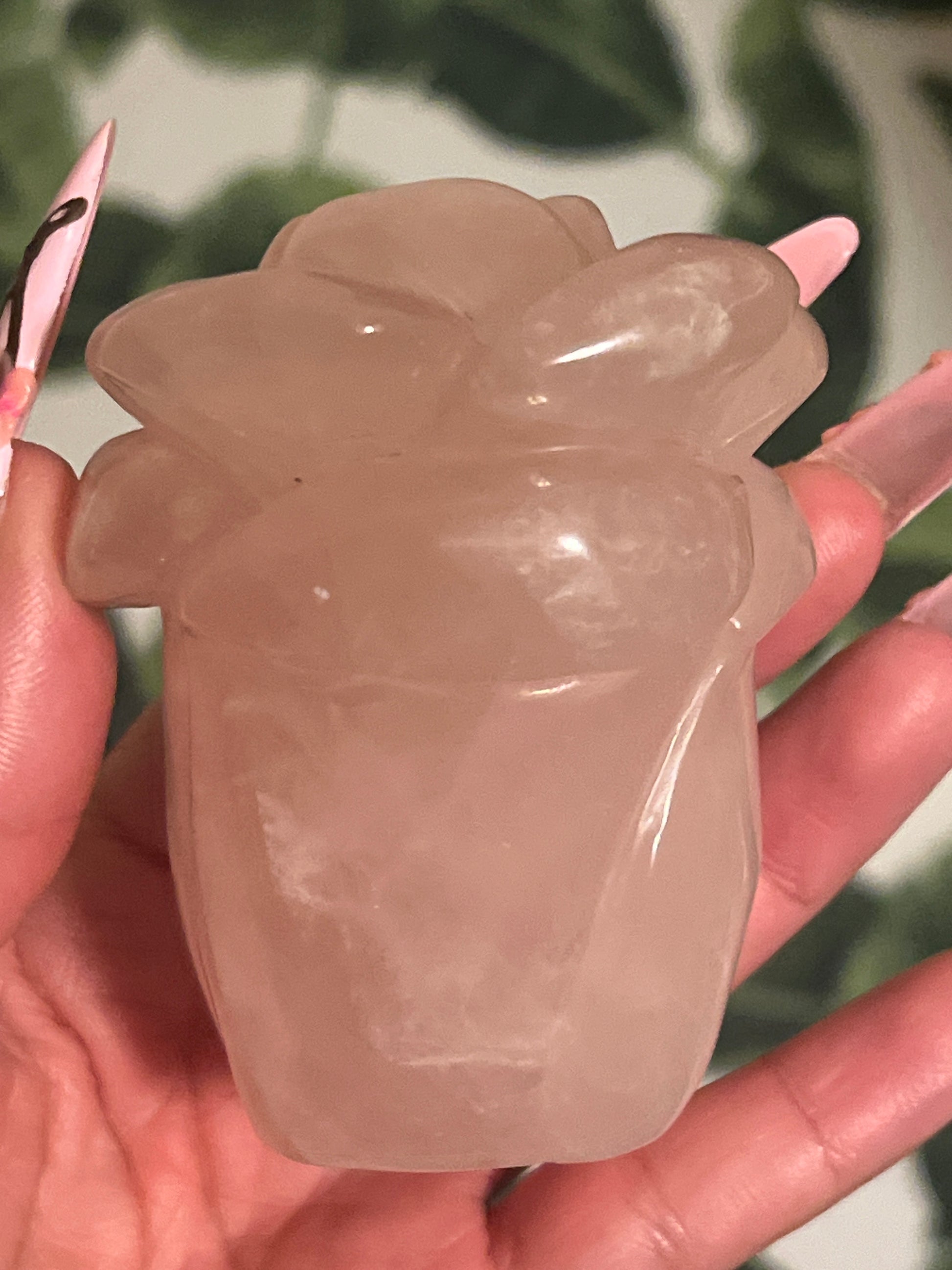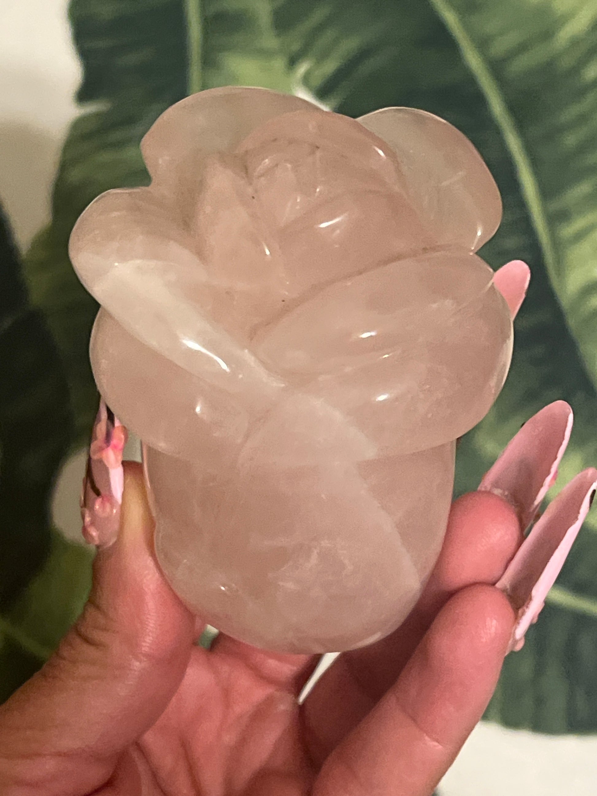 This silky chunk of Rose Quartz has been hand-carved into a lovely blooming rose that self-stands!