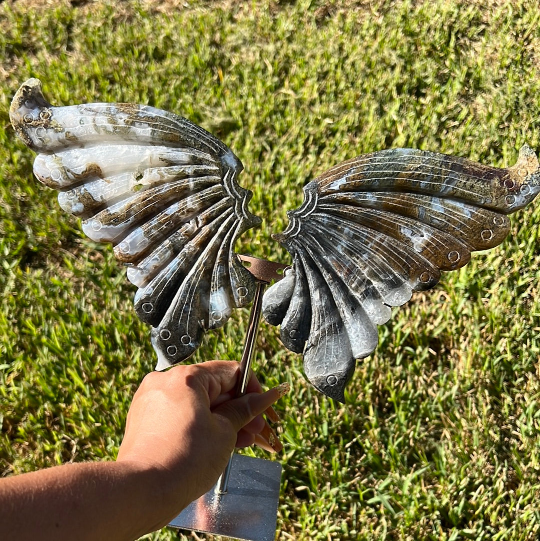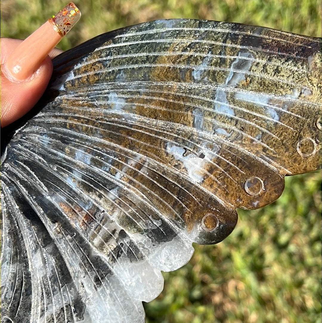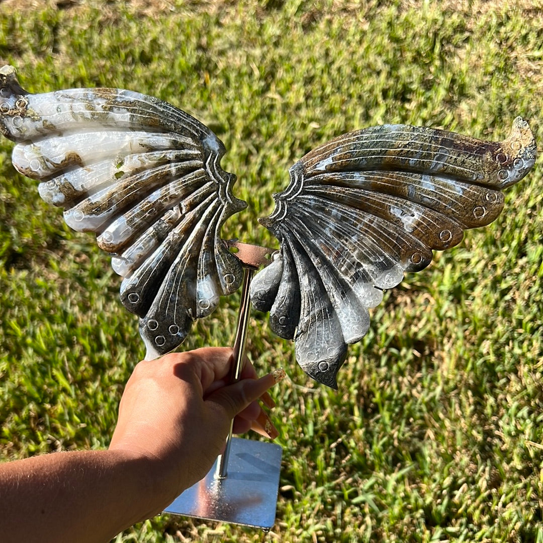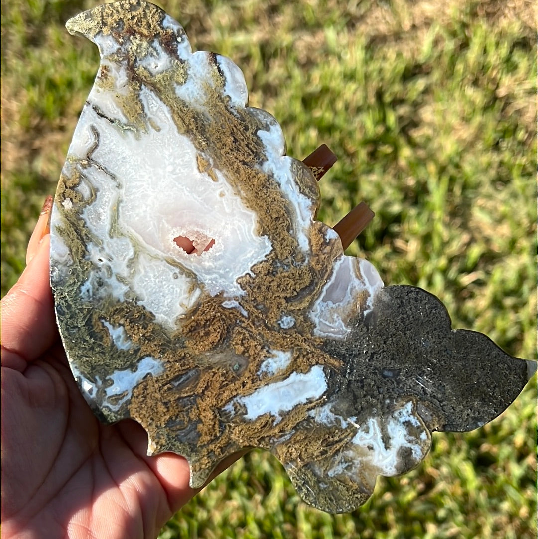 Whether you consider these to be butterfly or fairy wings, they are magical regardless! Deep green inclusions meet autumnal orange in the midst of sparkling quartz! These wings have an intricate design and small pockets of druzy! This entire set is fold with the silver adjustable stand!
