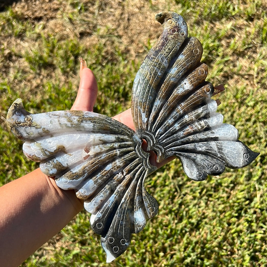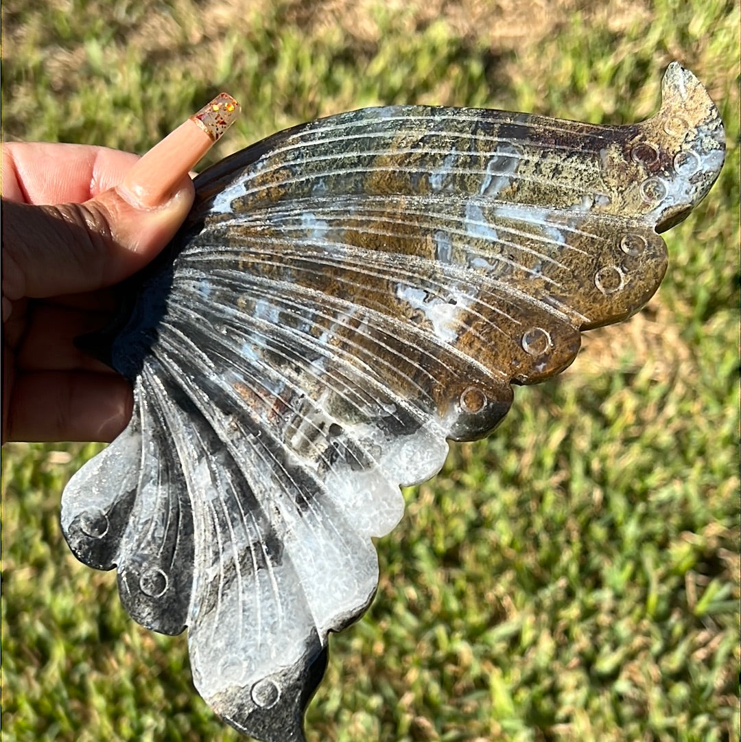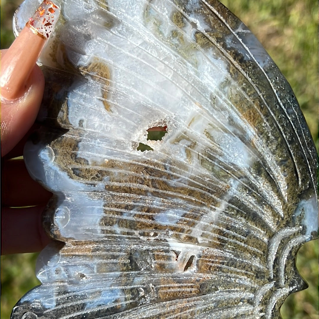 Whether you consider these to be butterfly or fairy wings, they are magical regardless! Deep green inclusions meet autumnal orange in the midst of sparkling quartz! These wings have an intricate design and small pockets of druzy! This entire set is fold with the silver adjustable stand!