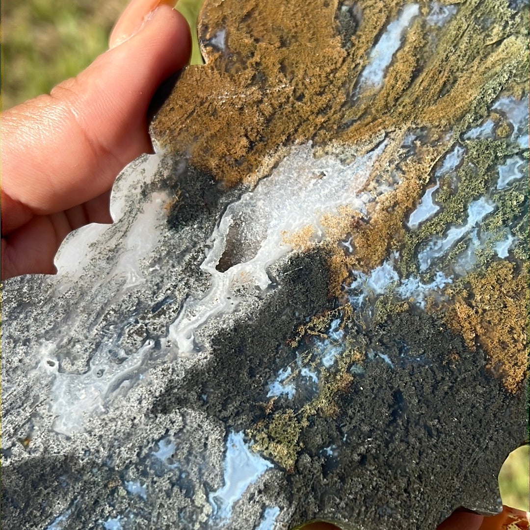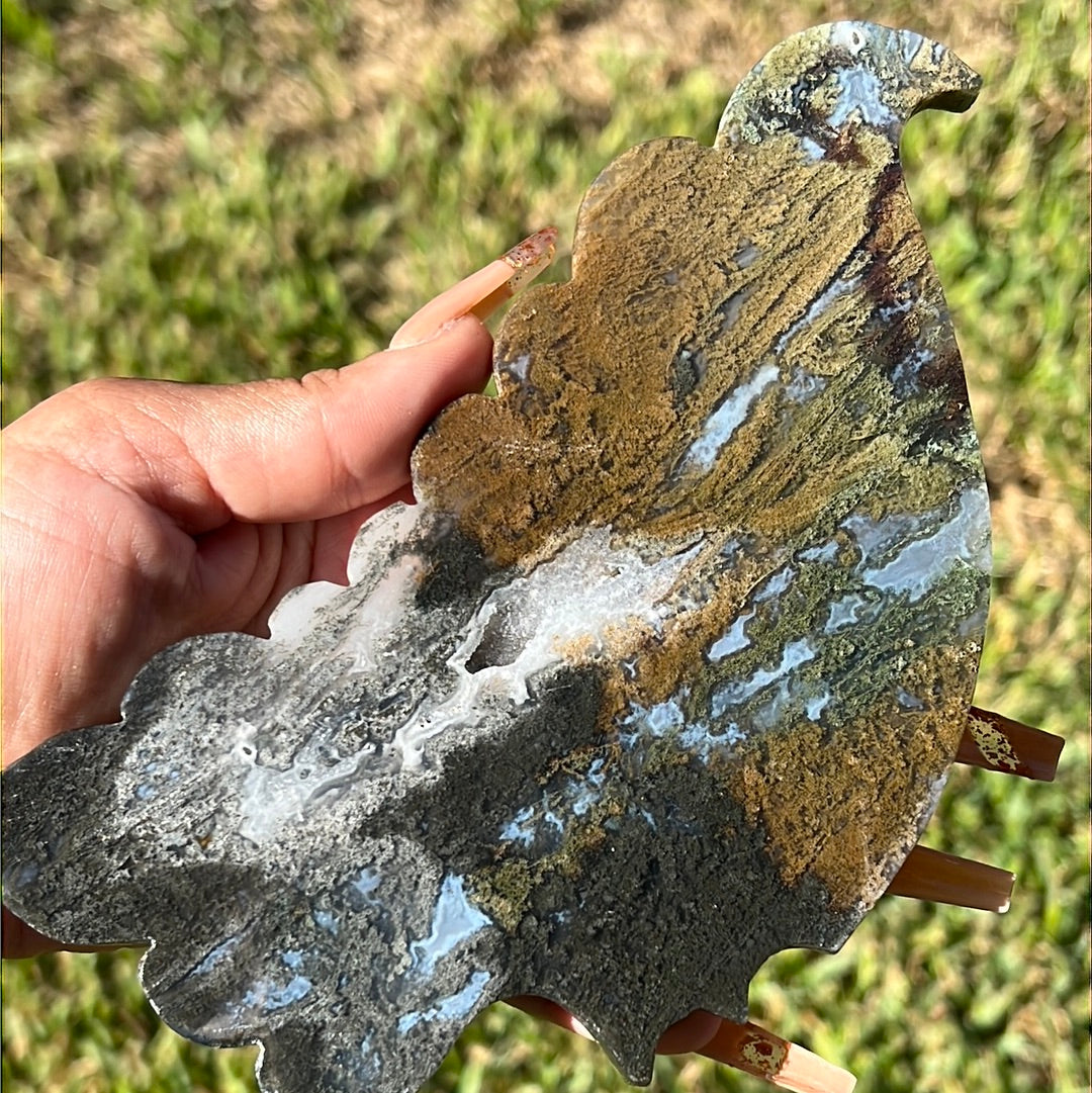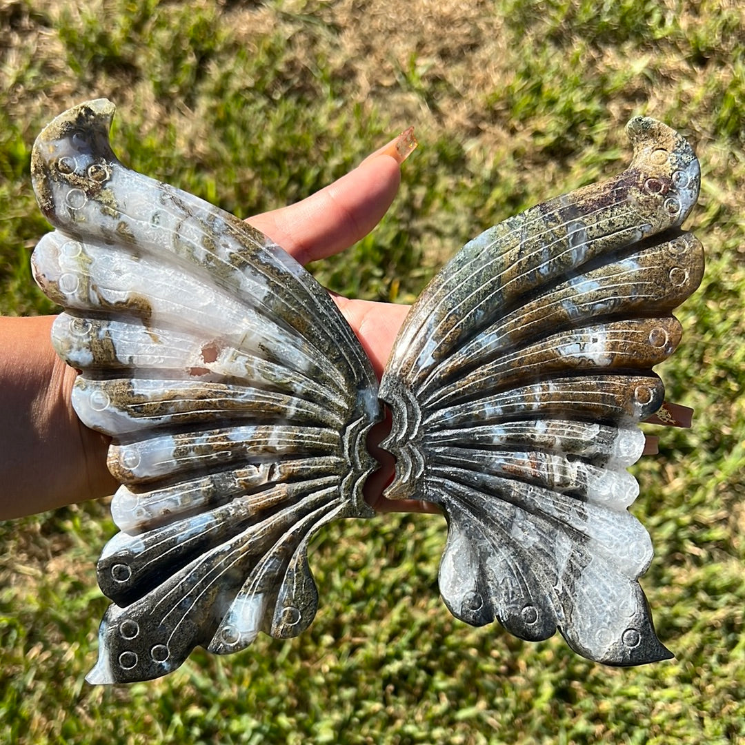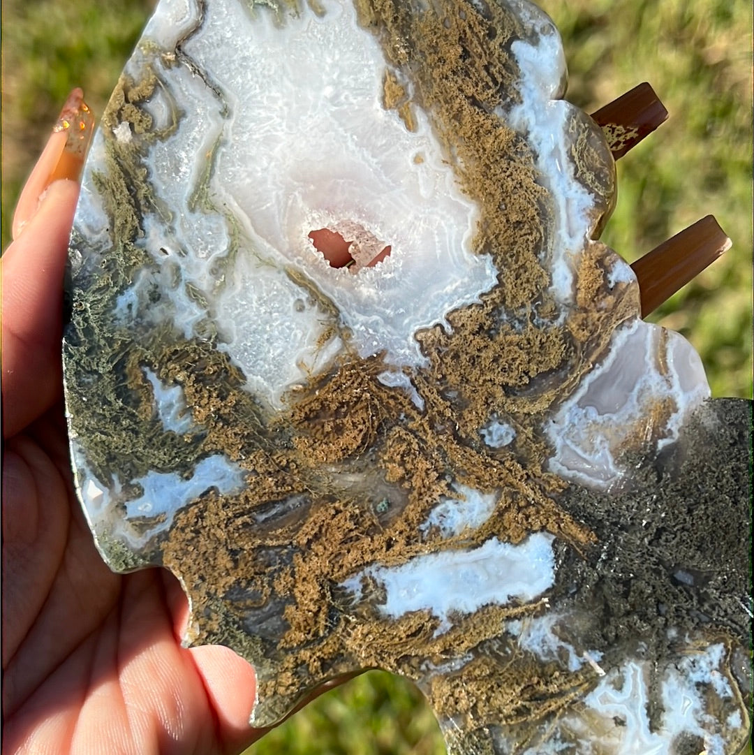 Whether you consider these to be butterfly or fairy wings, they are magical regardless! Deep green inclusions meet autumnal orange in the midst of sparkling quartz! These wings have an intricate design and small pockets of druzy! This entire set is fold with the silver adjustable stand!