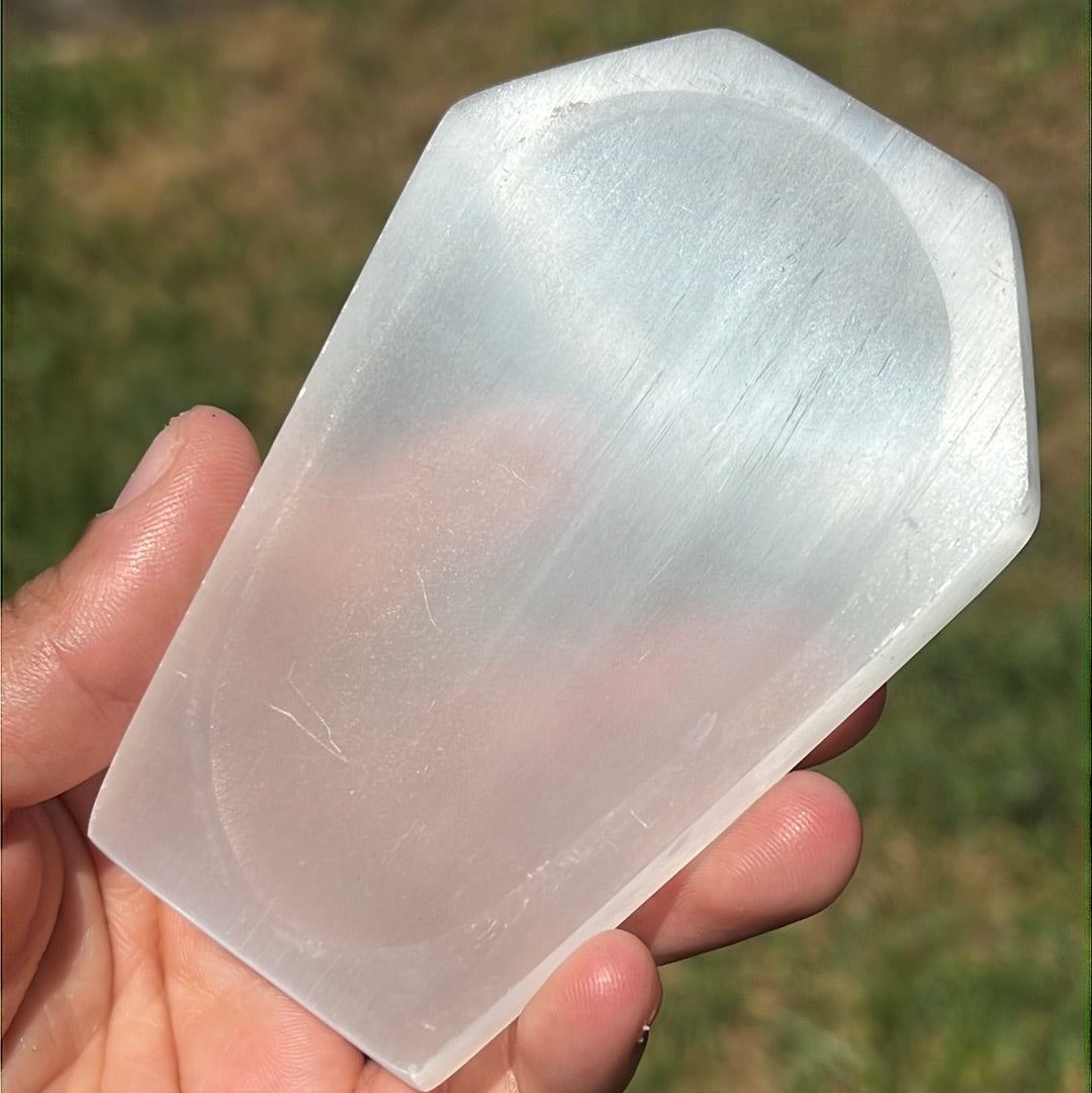 These beautiful cleansing satin spar bowls are carved in the shape of coffins! Great for decor or to hold your herbs and crystal trinkets!