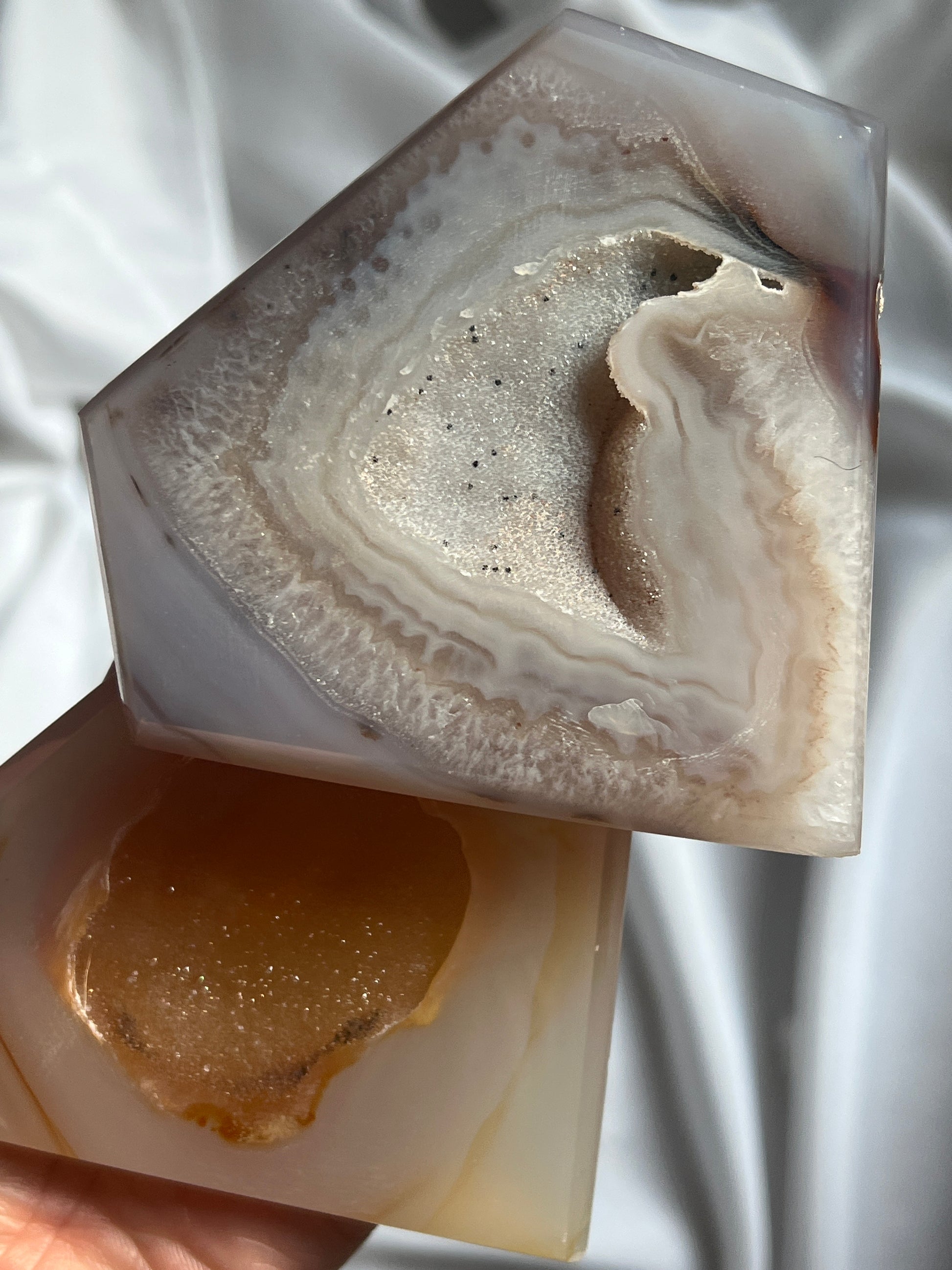 Beautiful druzy pockets peek through contrasting diamond-shaped Agate! Choose the fiery orange-cream Agate to boost your creativity and positivity. Choose the cool gray-blue diamond to enhance a relaxing vibe. *These are individually sold and come with an acrylic stand.*