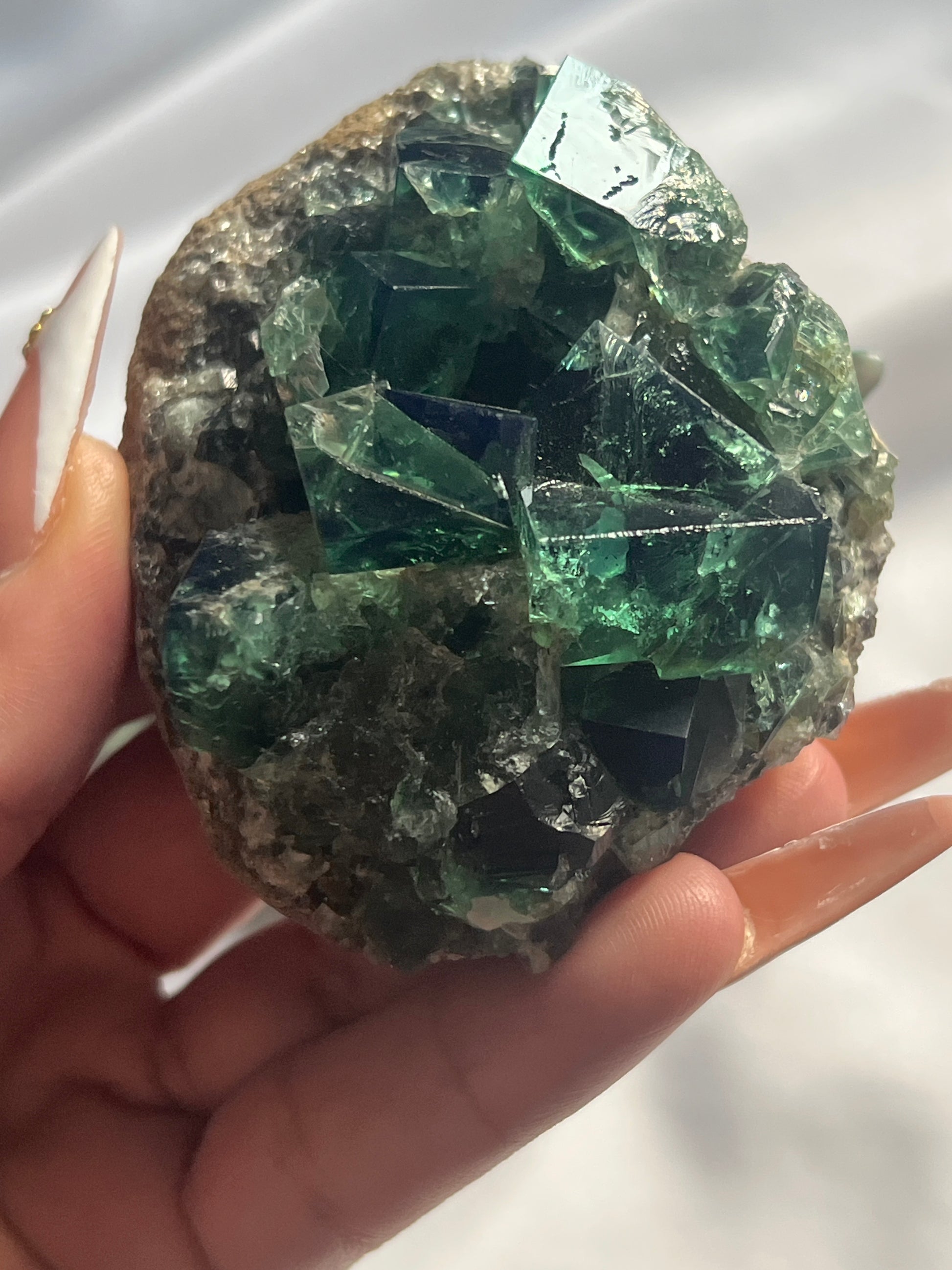 In September 2023, an absolutely stunning pocket was discovered in the Diana Maria Mines whilst the Aurora Borealis danced above England, hence the name “Northern Lights”. These beautiful clusters exhibit striking green color and blue daylight fluorescence.