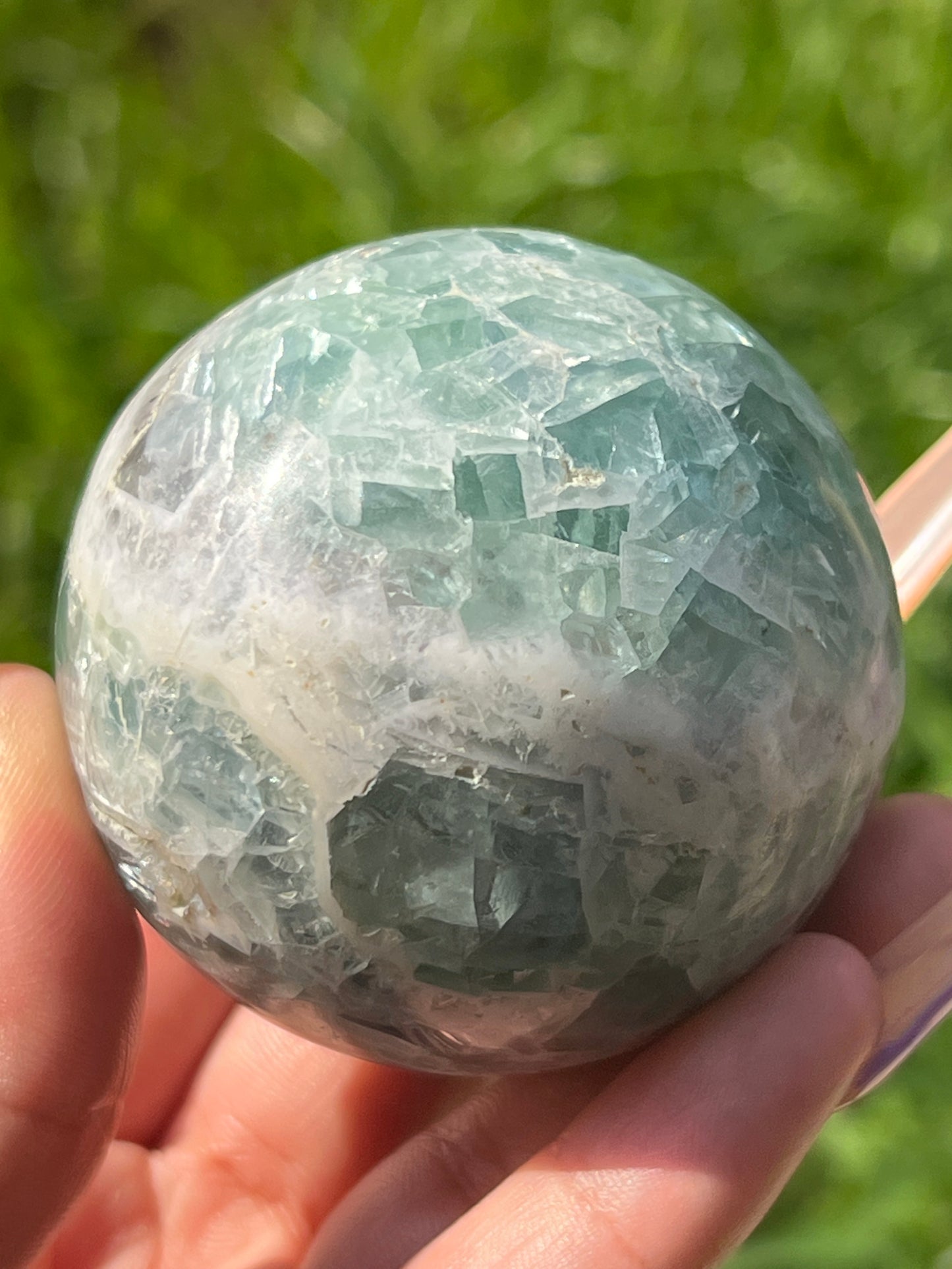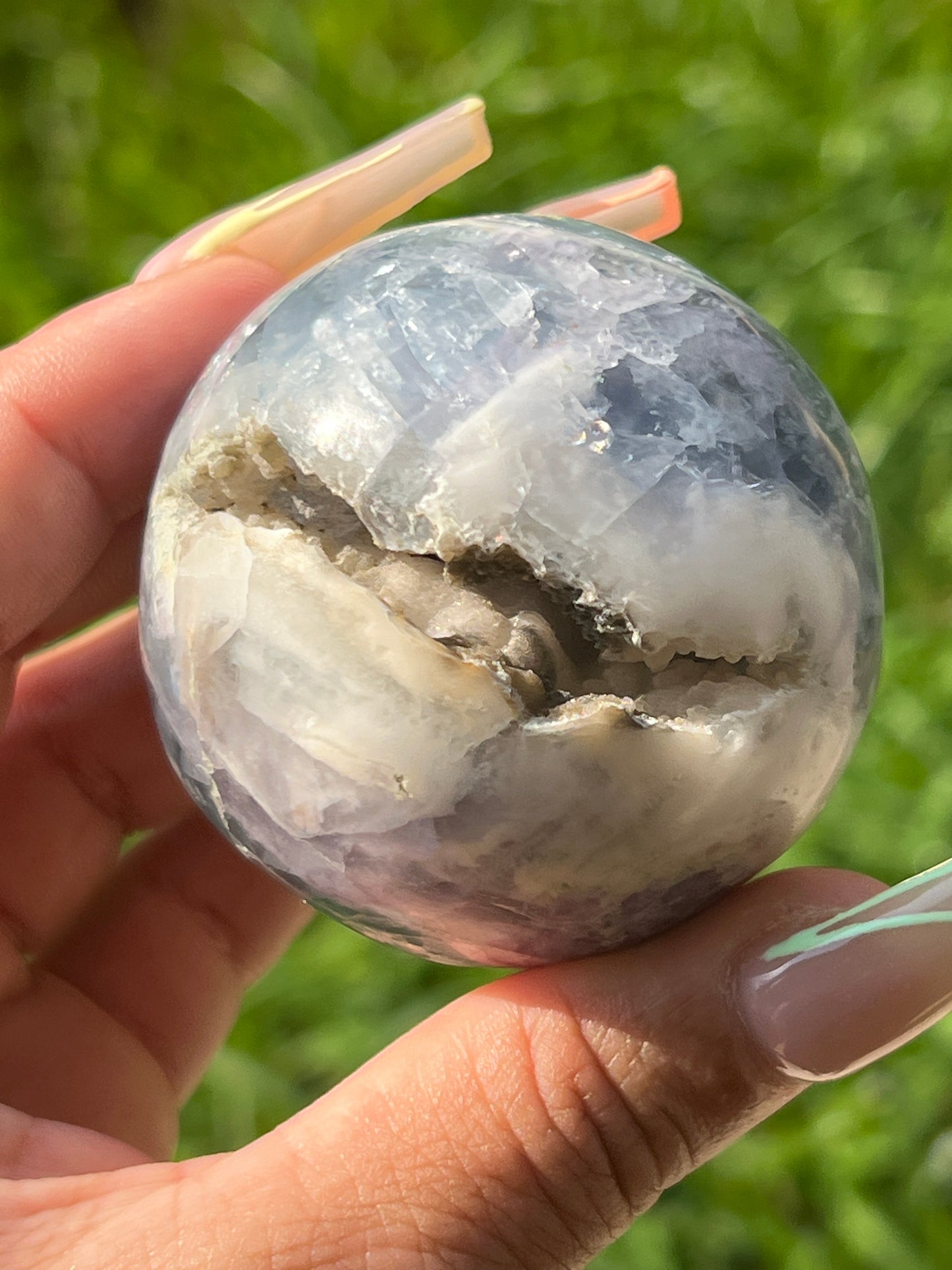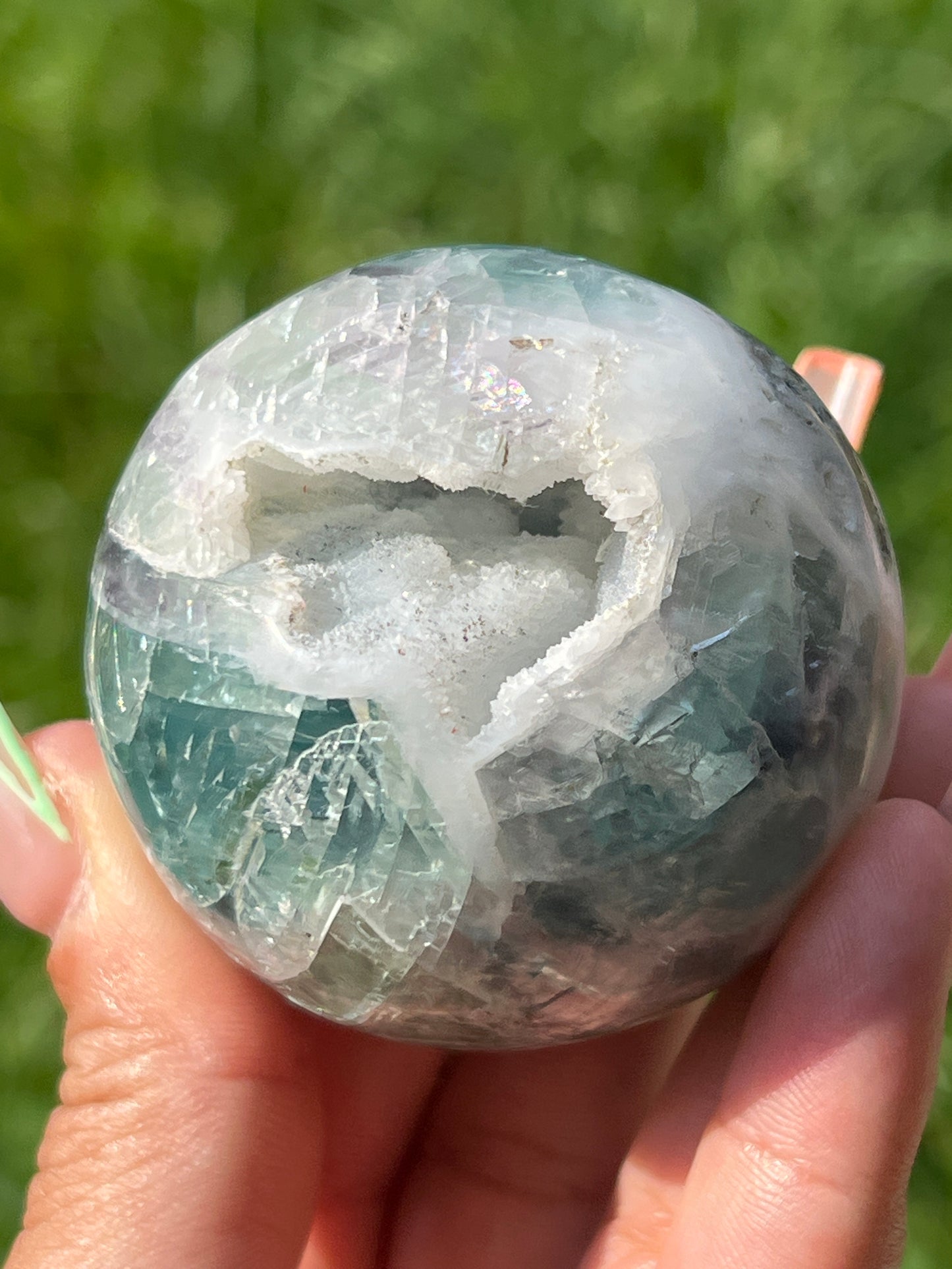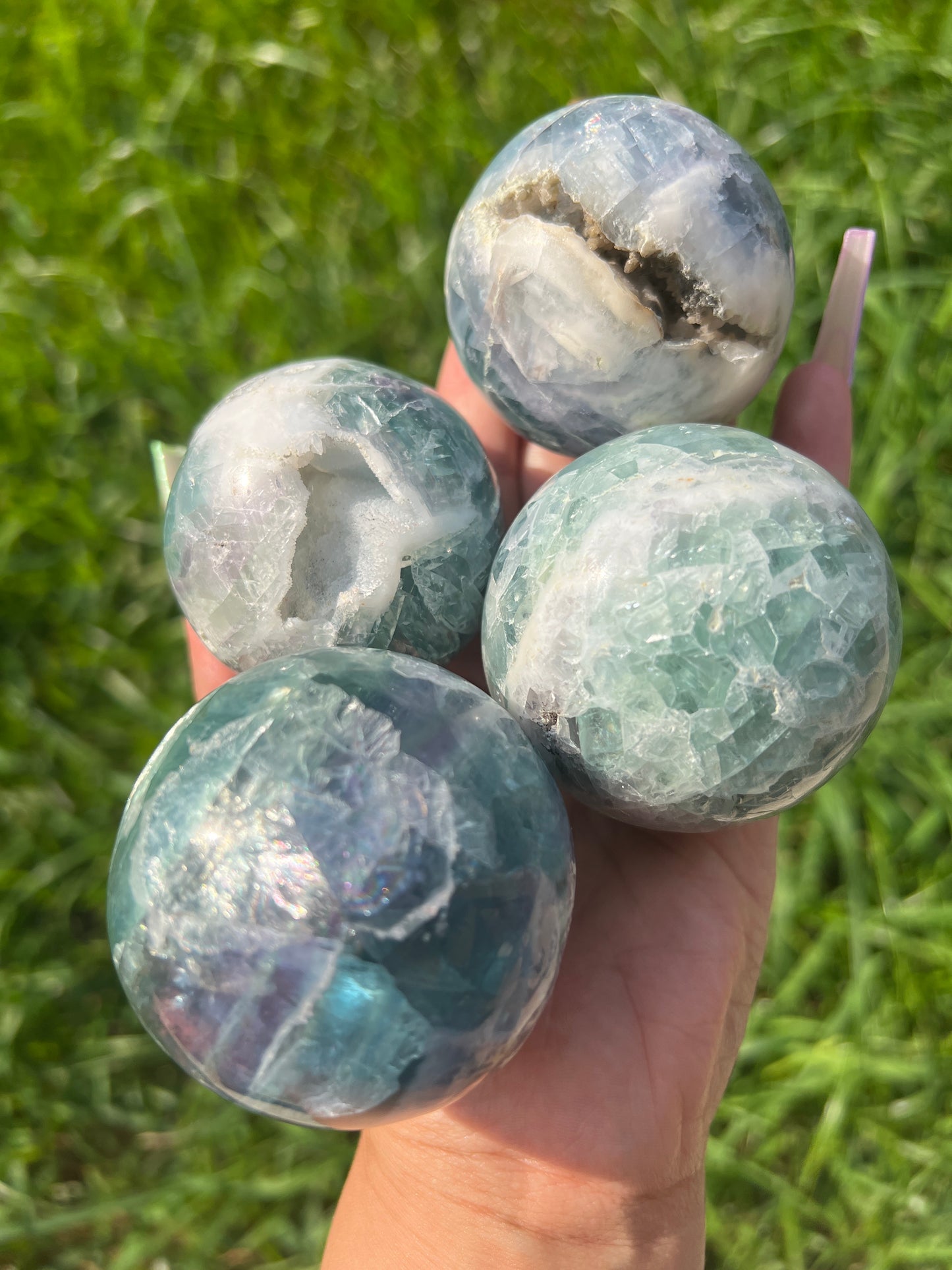 Enhance focus, memory, and creativity with our "Oceanfront" Fluorite Spheres. These stunning spheres in shades of purple, blue, and green are not only visually appealing, but also offer potential benefits for the mind. Perfect for those seeking a unique and practical addition to their decor or crystal collection!