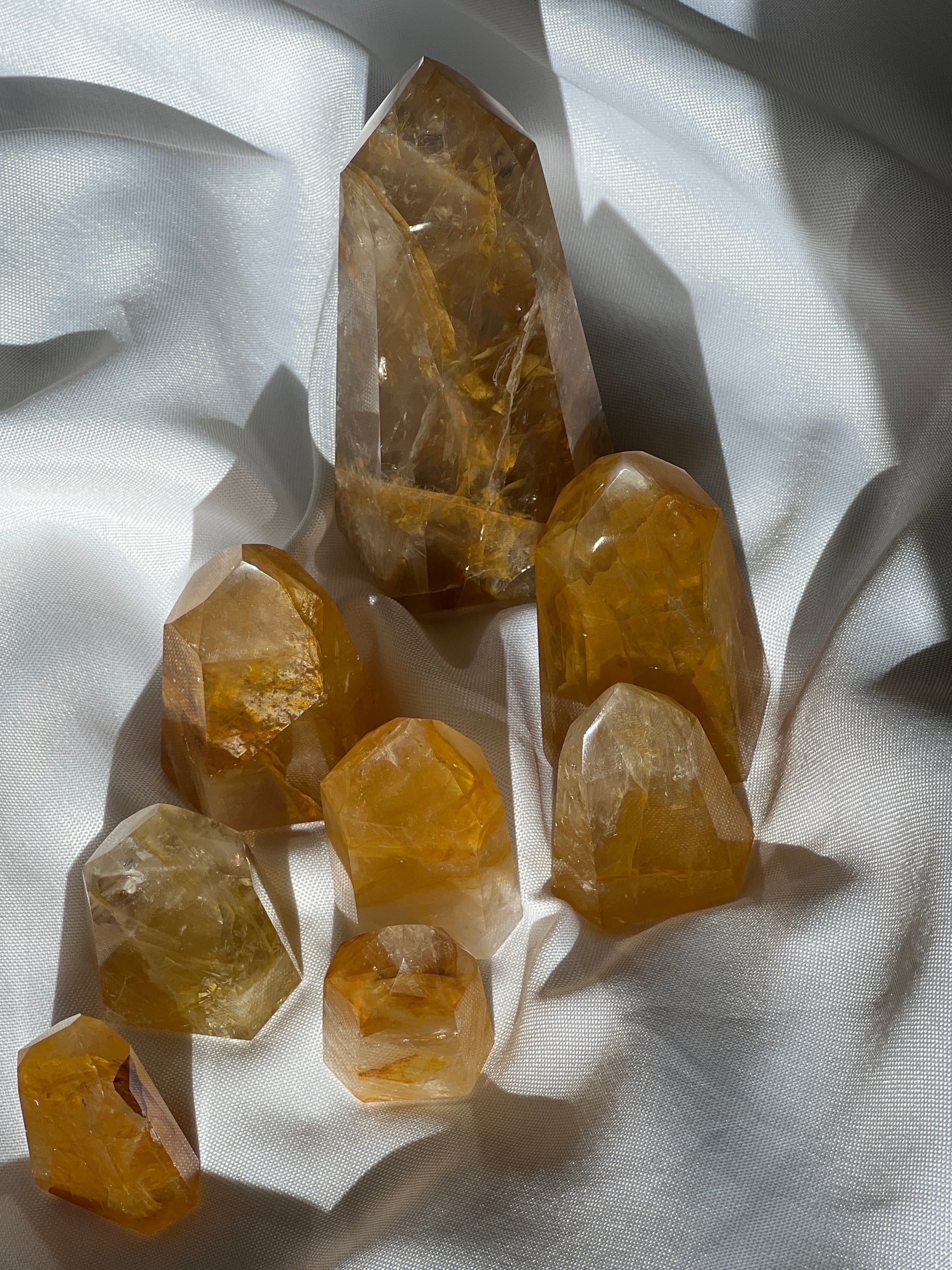 Glowing deep yellow Golden Healer Towers are carved into smooth, beautiful towers with goddess cut faces, indicative of crystals sourced from Brazil!
