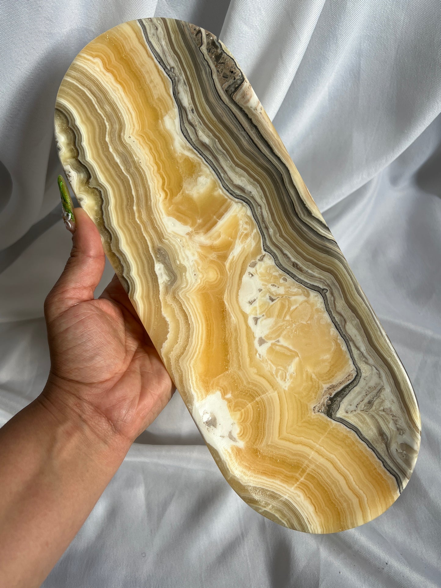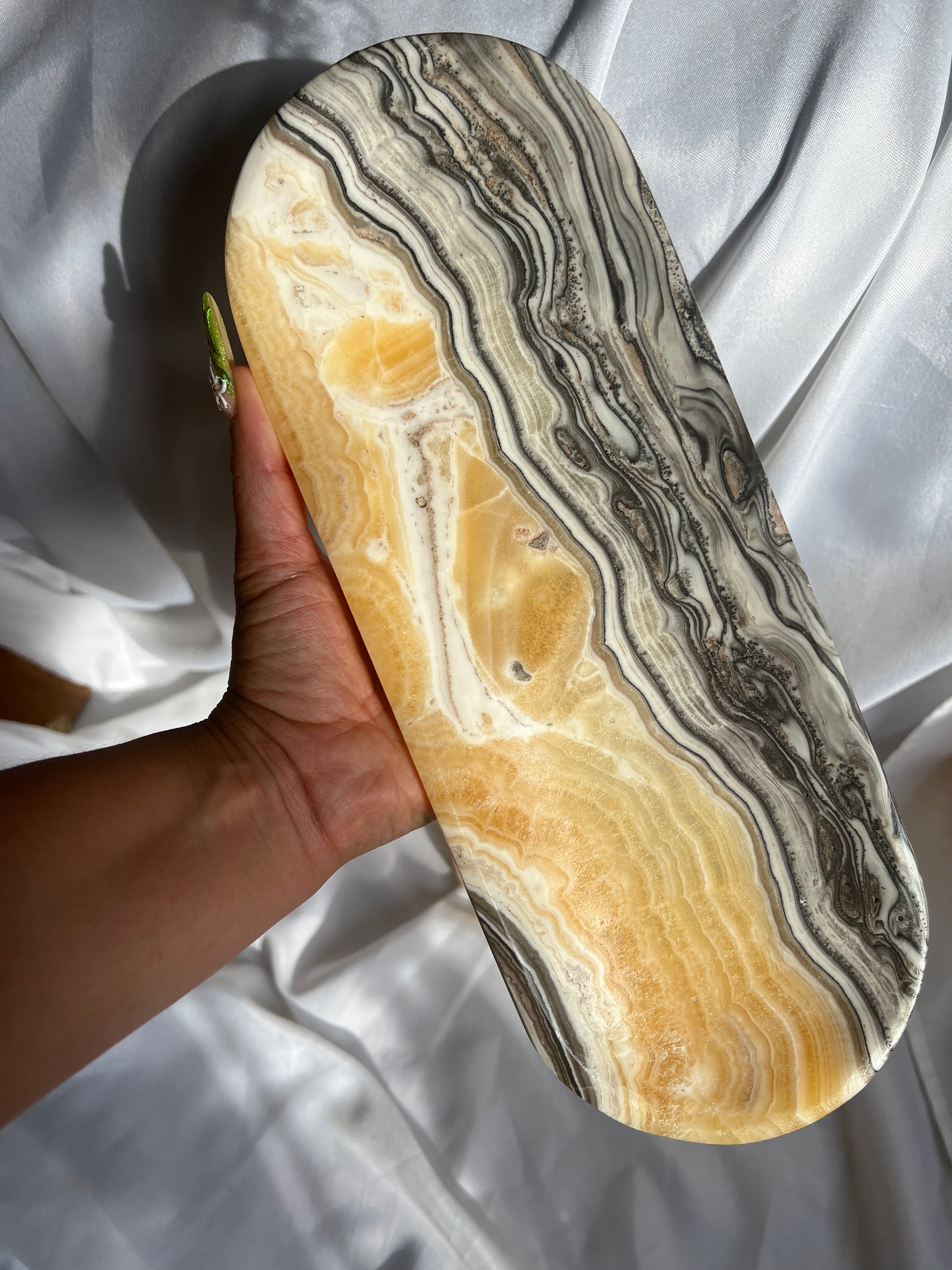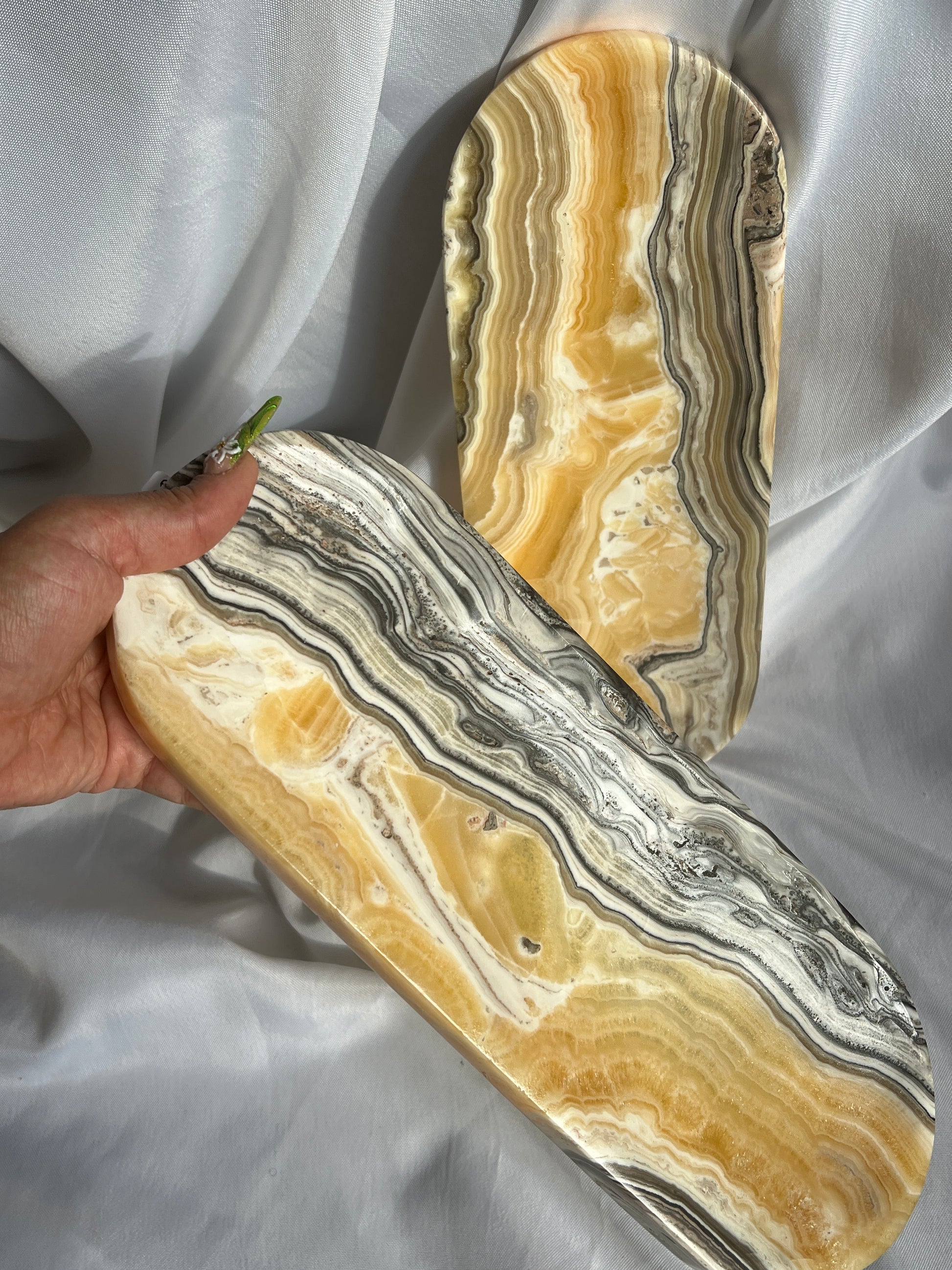 Gorgeous Onyx & Calcite Trays bring joy, grounded energy, and a pep in your step! These large trays are excellent additions to your space, serving as functional decor pieces while also being beautiful stand alone decor.
