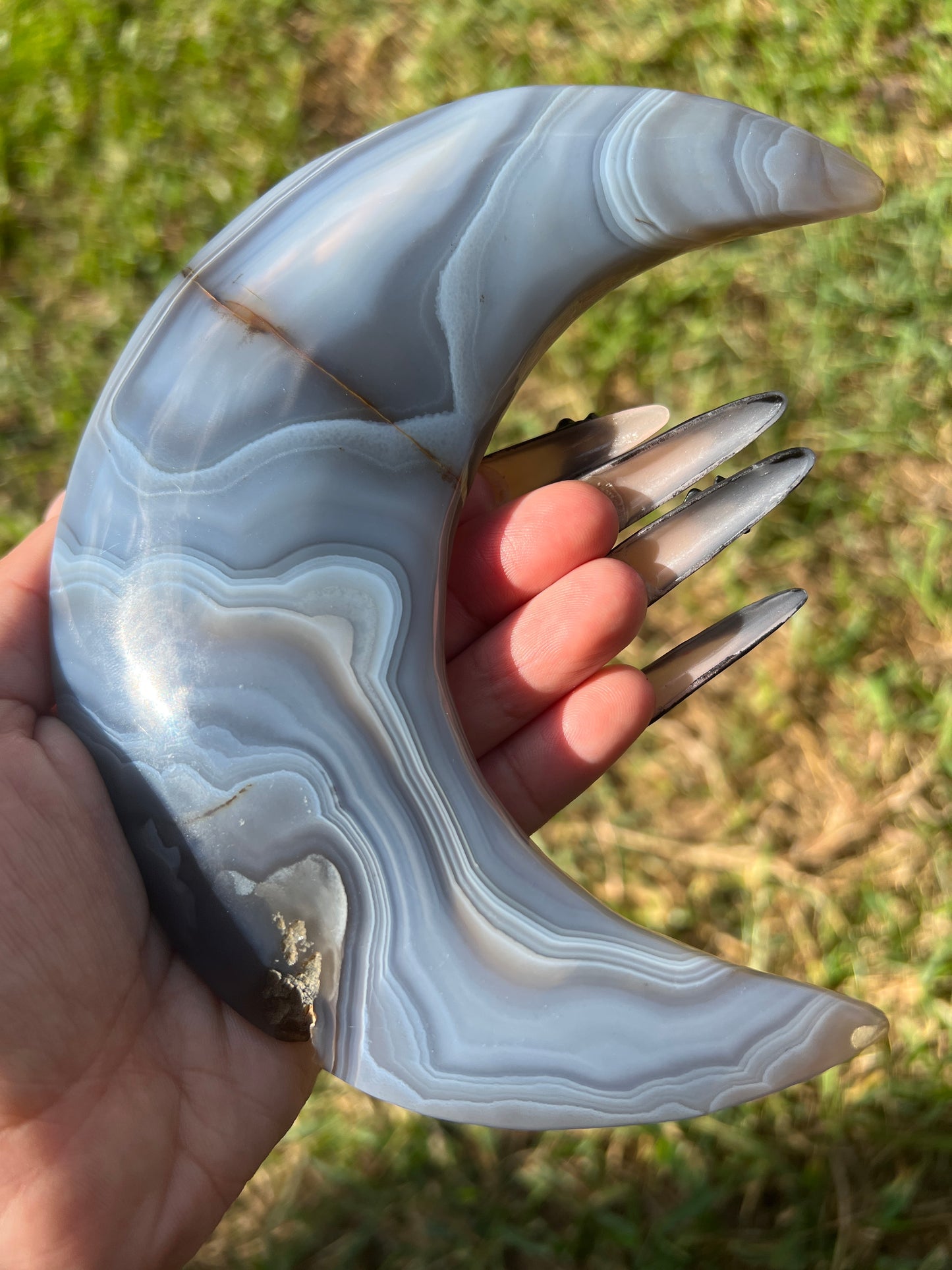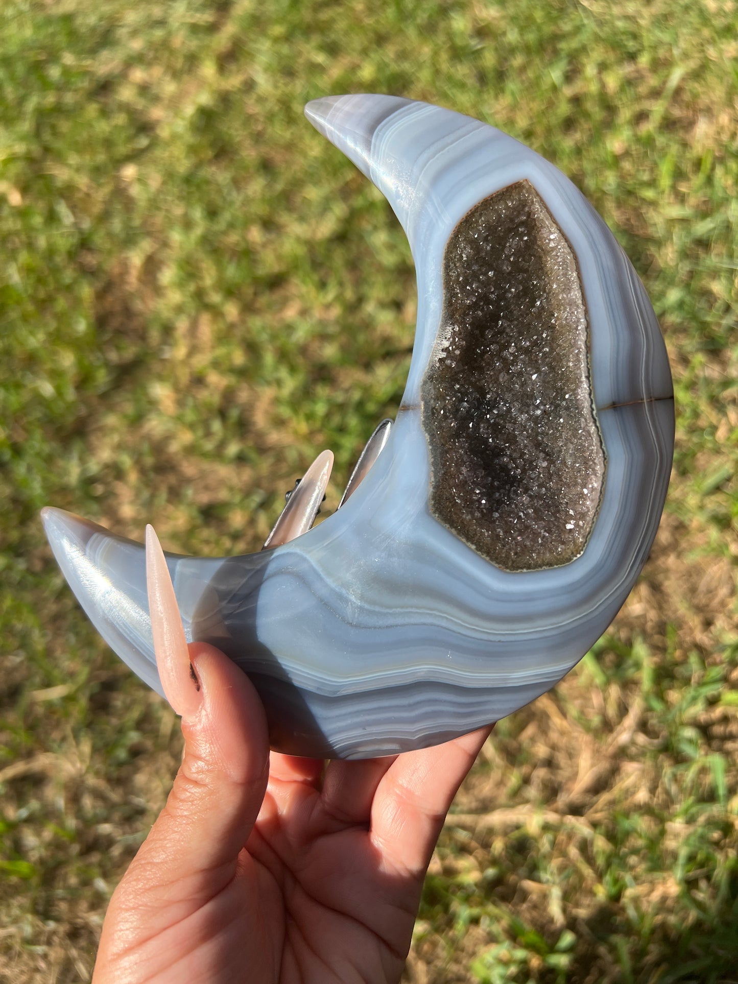 A simple black stand is included with this stunning statement Druzy Banded Agate Moon! Agate is super grounding. The moon represents divine femininity as well as transformation and adaptability through life cycles!