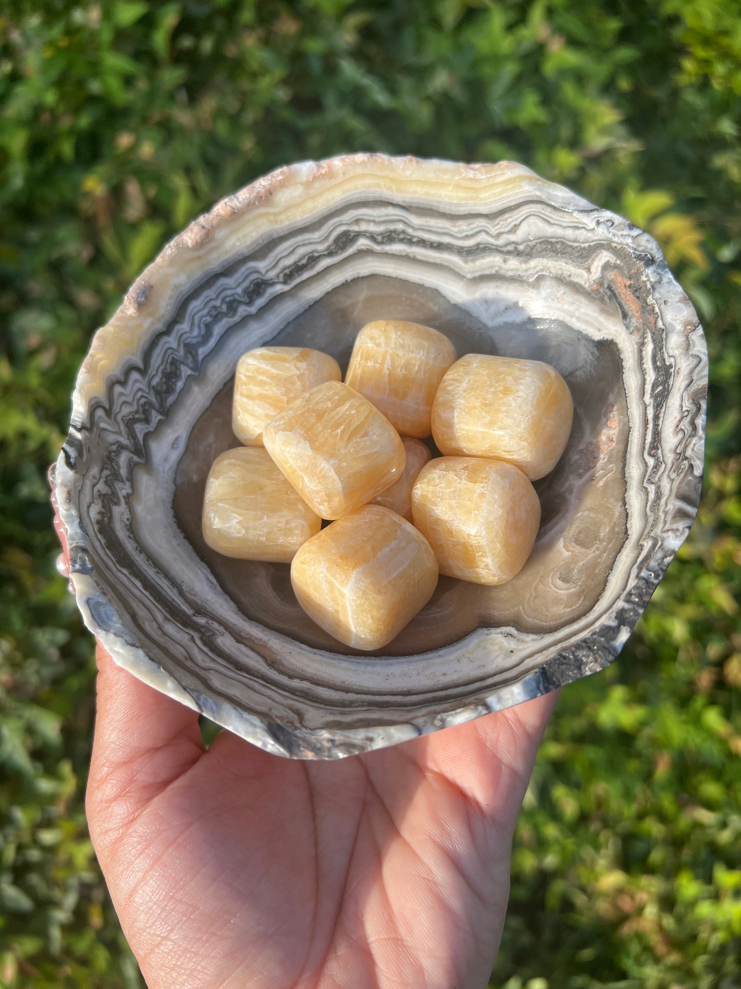 Beautifully polished Mango Calcite Tumbles make a wonderful addition to your crystal display, meditation mix, or pocket pal! Add some positive, refreshing vibes to your intentional life with these smooth and juicy tumbles! *These are individually and intuitively sold.*
