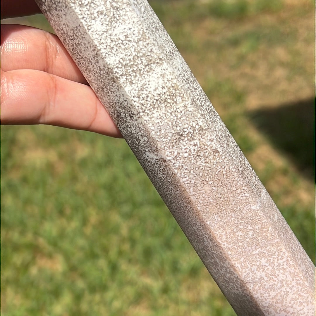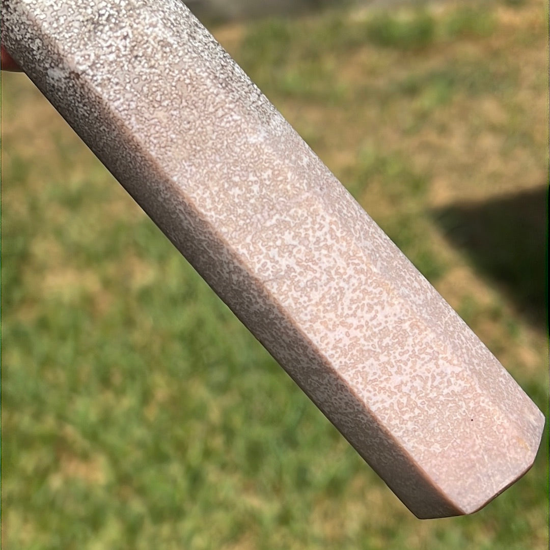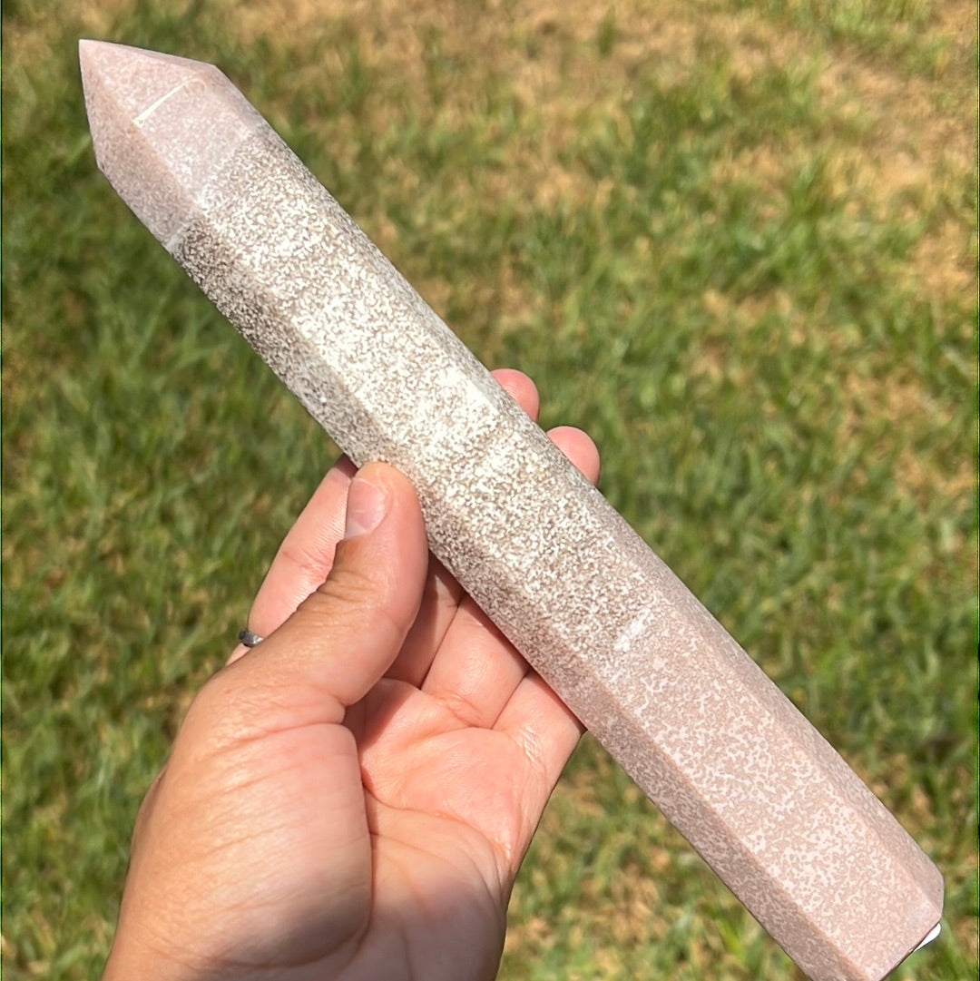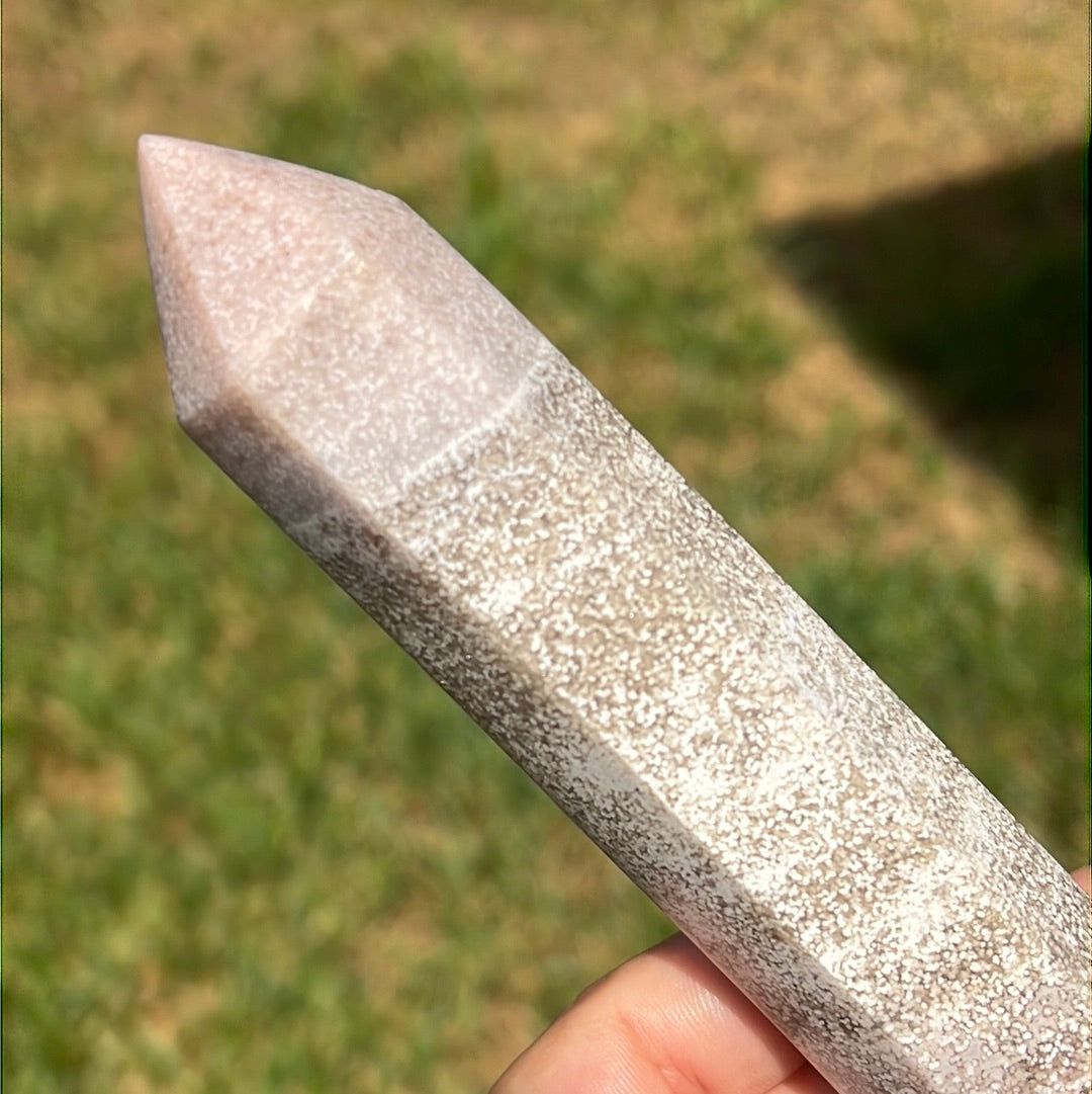 A beautiful soft pink jasper tower with olive green, pink, and white orbs! Height: 9 inches