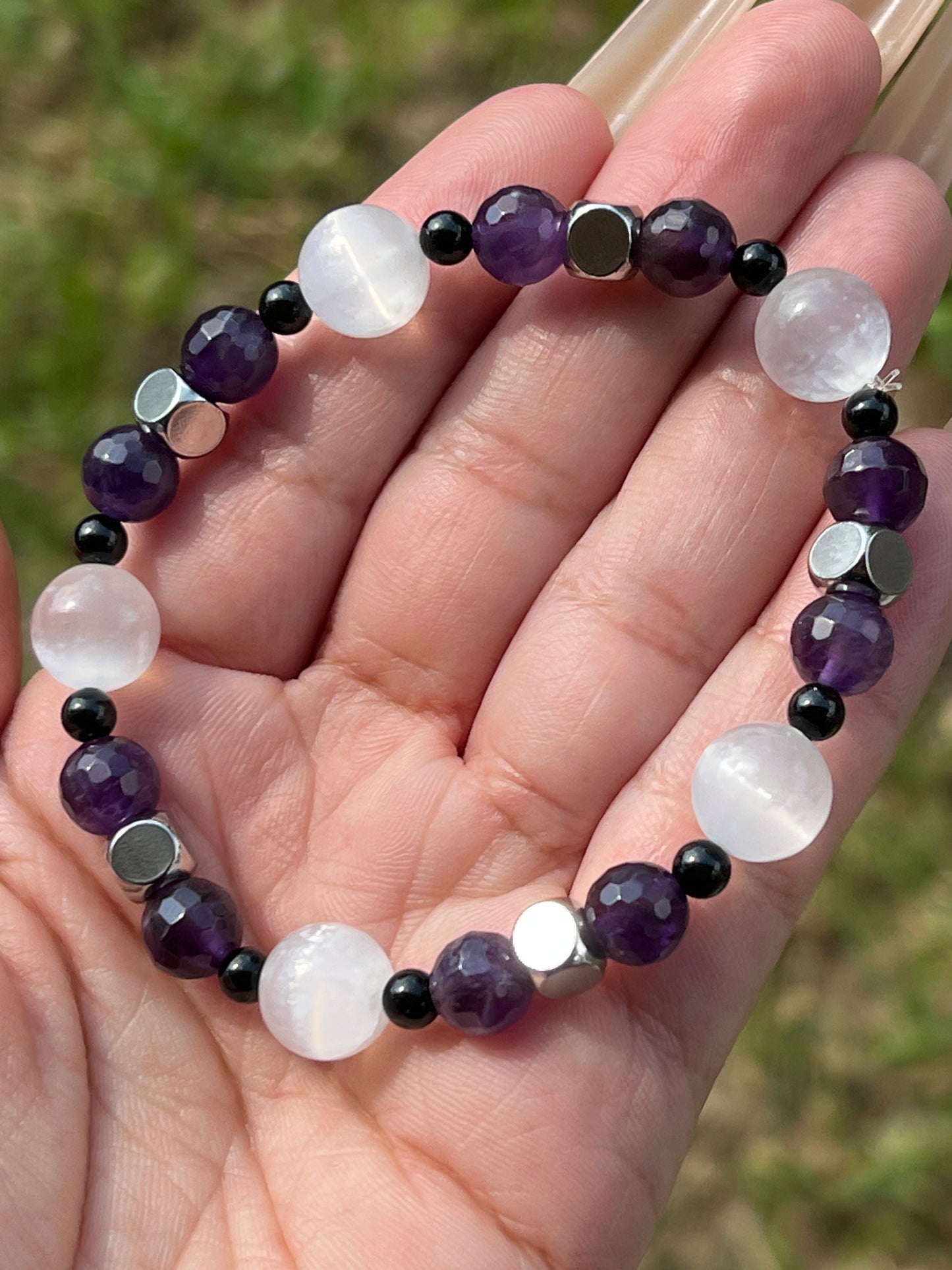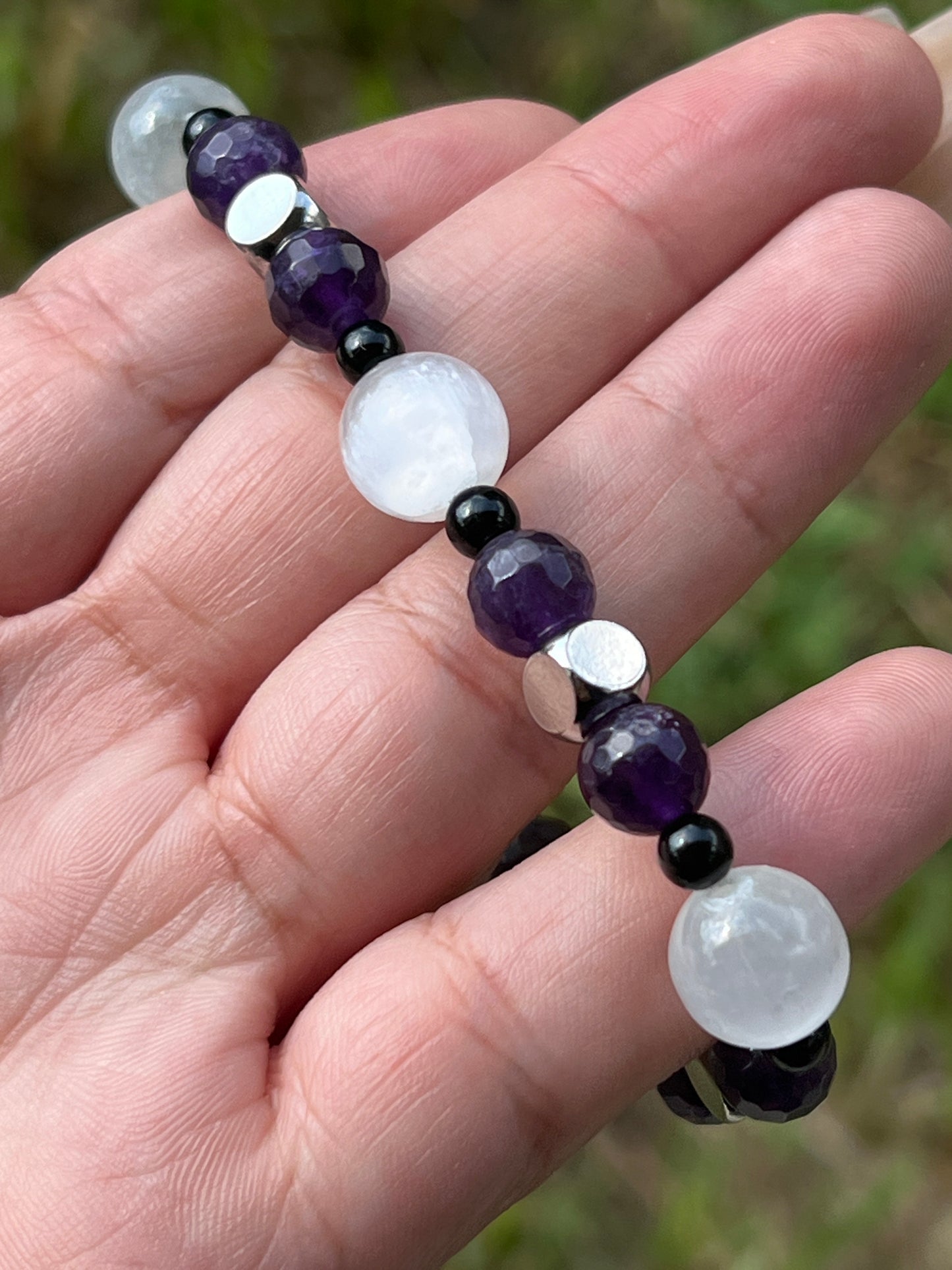 This wonderfully wicked Crystal Bracelet is strung together with Satin Spar, Amethyst, and Black Tourmaline with stainless steel spacer beads. The combination of these crystals is believed to bring balance and protection. Perfect for those who want to feel centered and safeguarded while making a statement.
