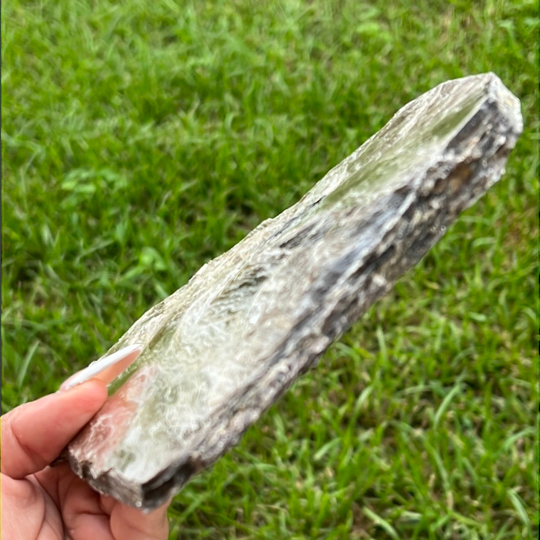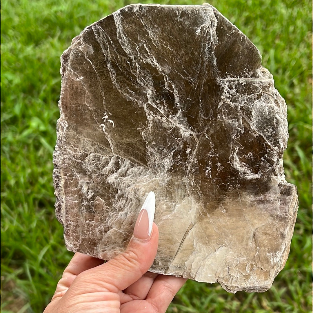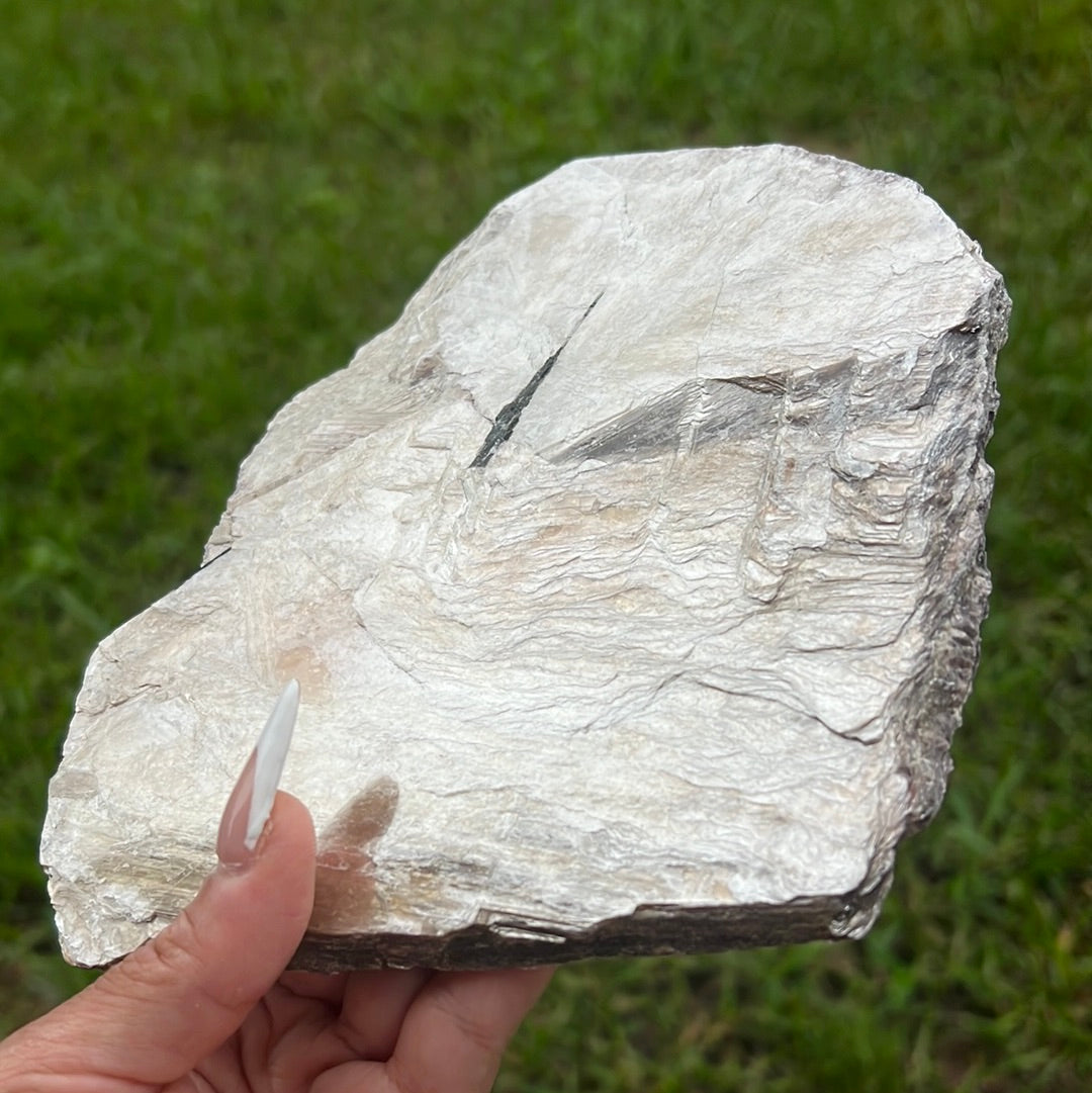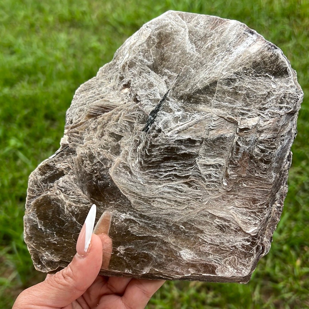 Our "Gilded" Large Golden Mica Slab is a stunning beauty! With layers of chatoyant mica and a hidden black tourmaline pocket, this large slab is a must-have for any collector or enthusiast. Enjoy the unique benefits of this mesmerizing piece.