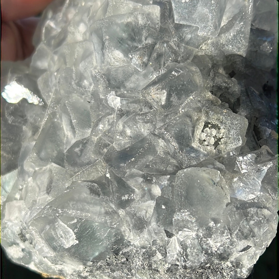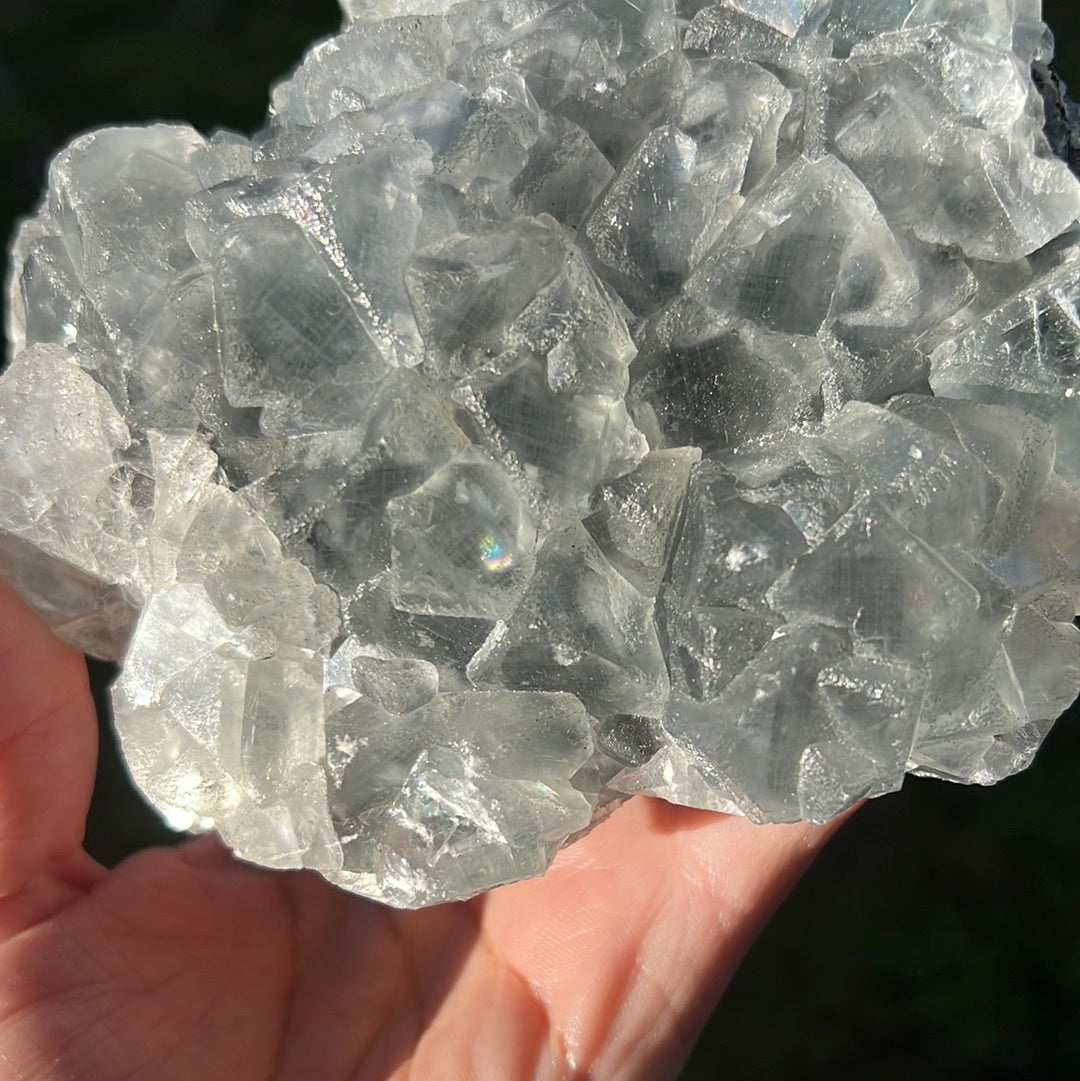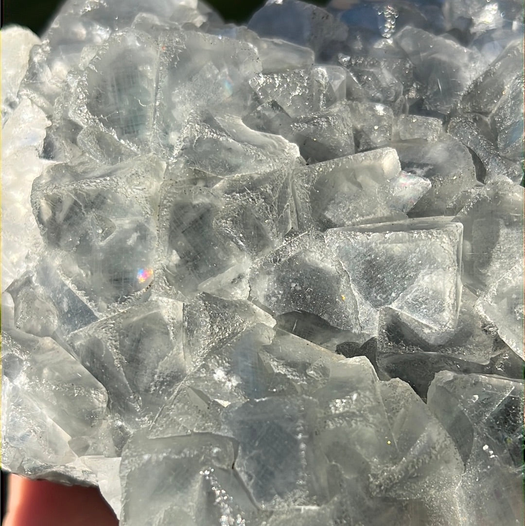This statement Xianghualing Fluorite cluster is quite the collection piece with stunning clarity, rainbows and small pockets of Calcite! Modified corners give these cubes a softer touch and octahedral formations form around the sides!