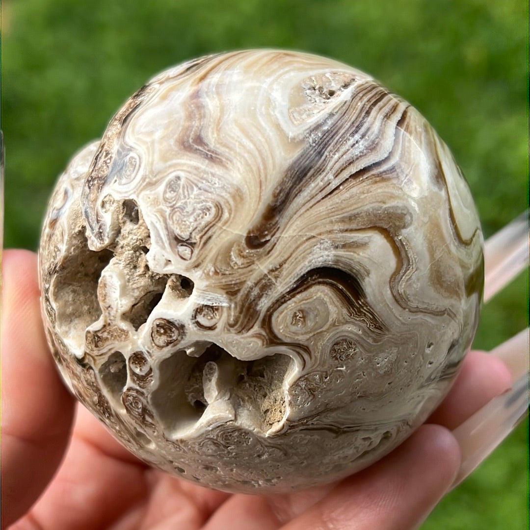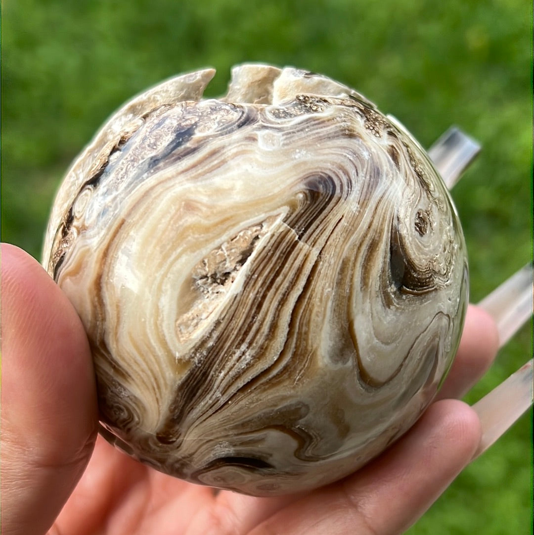 Chocolate-y browns and creams swirl together in a large, PAC-MAN like Chocolate Calcite Sphere!