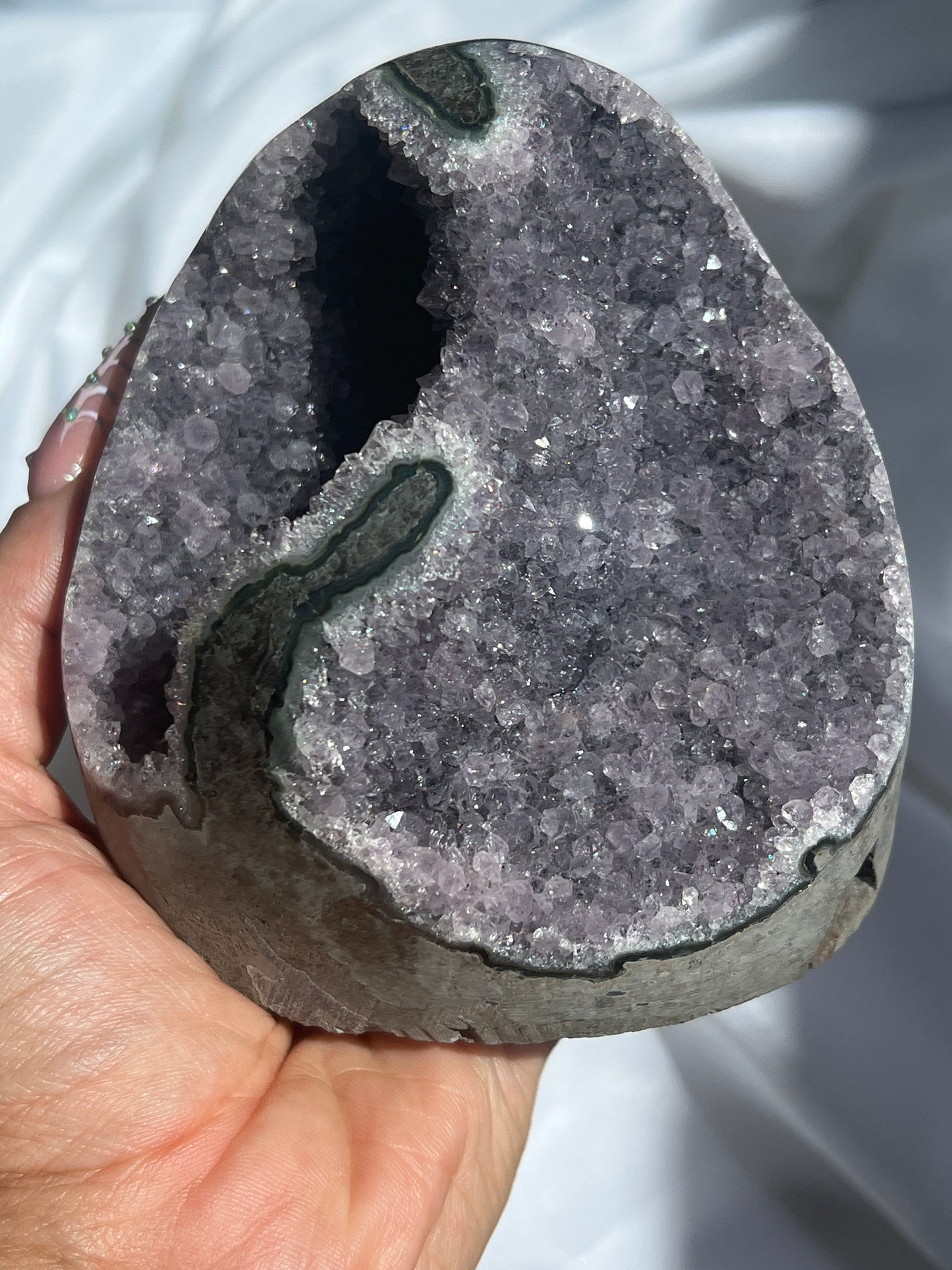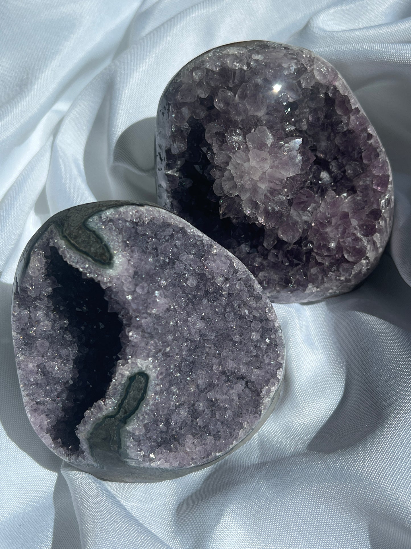 These stunning chunky clusters of lavender-hued Amethyst crystals are the perfect addition to your sacred space. With a calming, protective energy and self-standing base, these cutbases or free forms are aesthetically pleasing and portable!