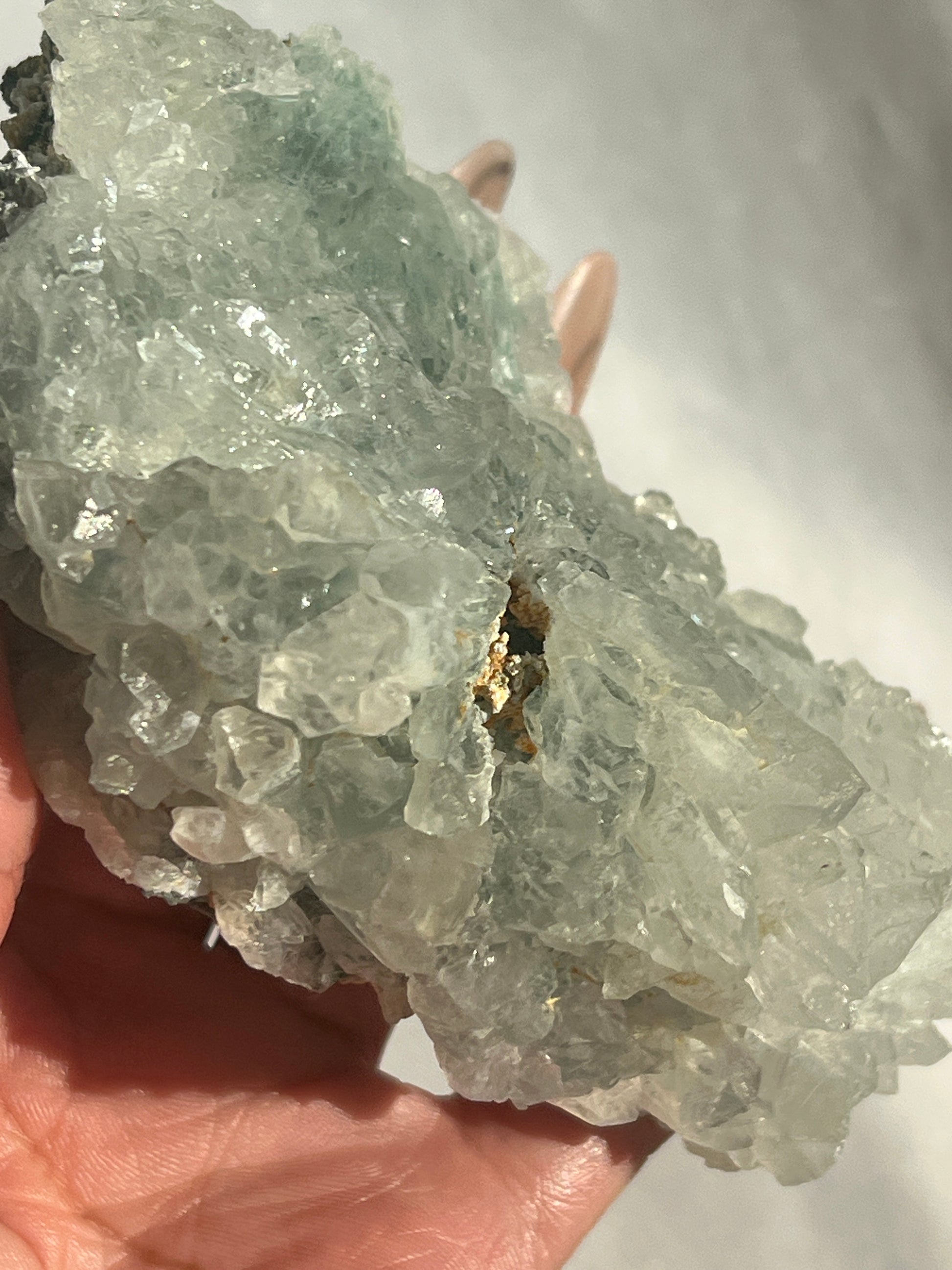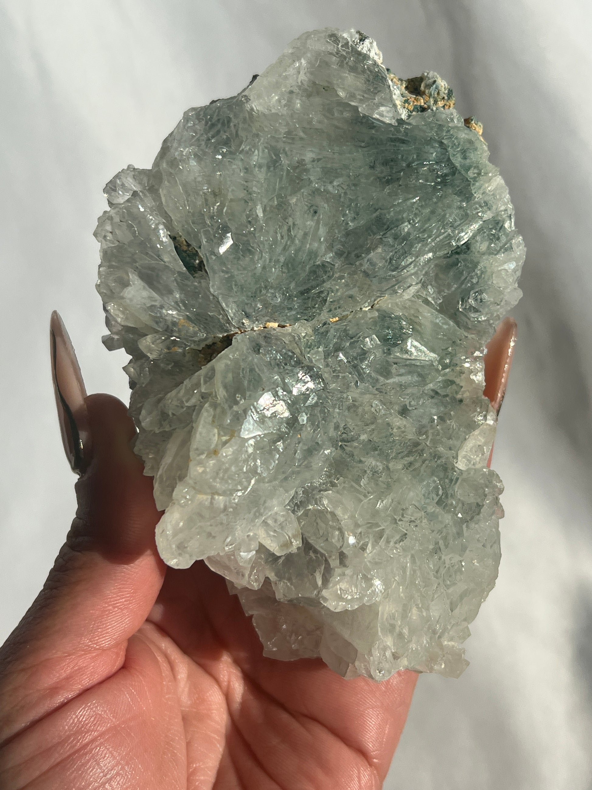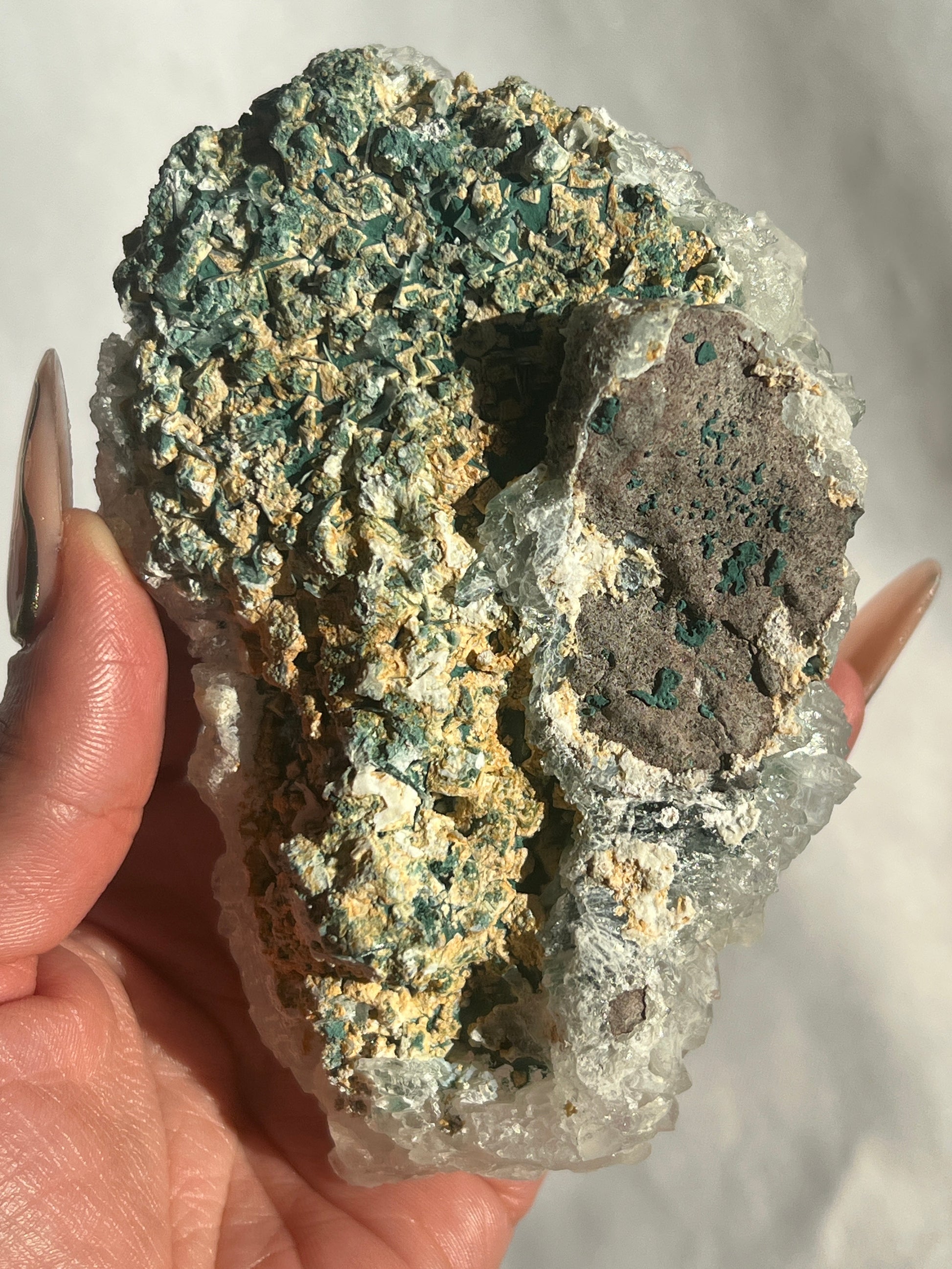 Beautiful sparkling points form flower-like blossoms on a Jasper green-blue matrix! Enjoy the magical properties and aesthetic of this cluster. Amethyst Flowers are relaxing, protective, and strengthen spiritual connection.