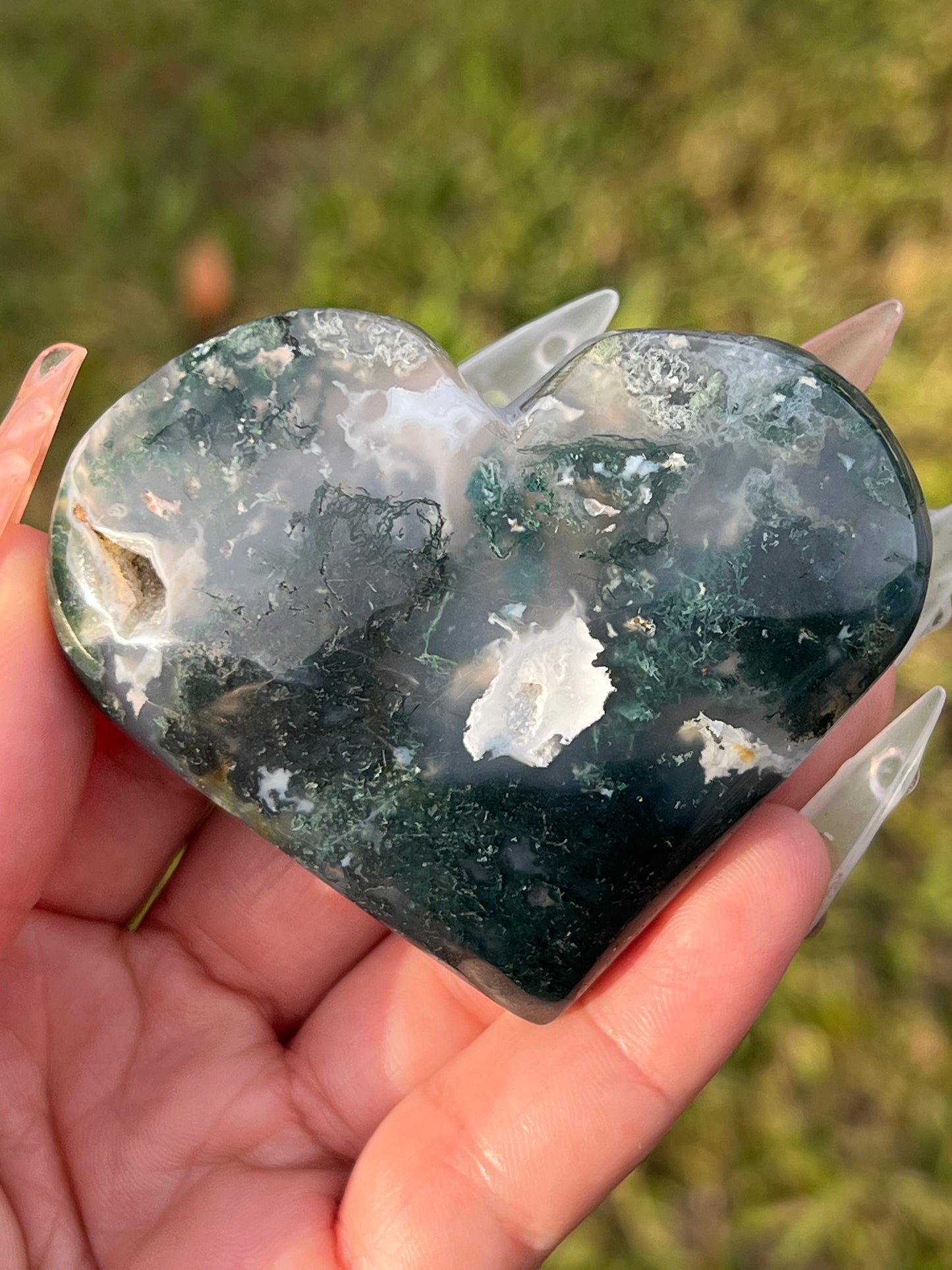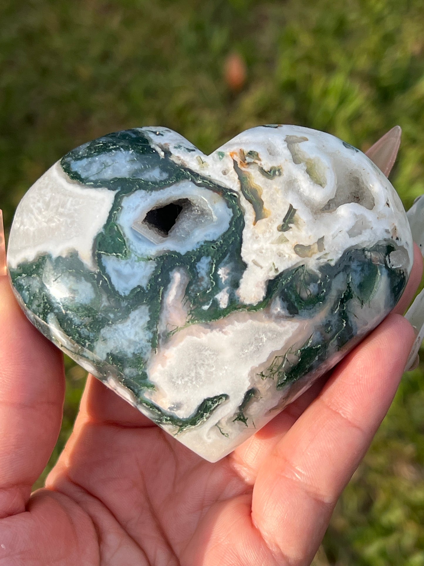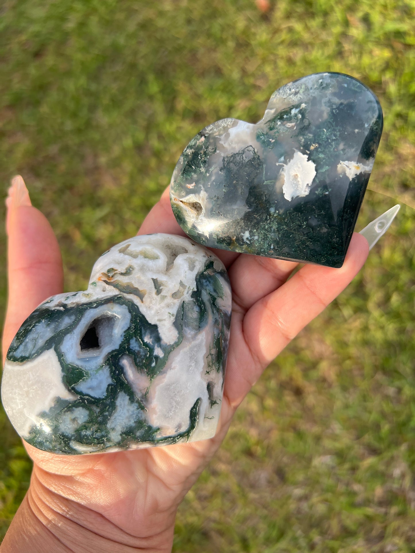 These beautiful nature-inspired Moss Agate Hearts have stolen my own as I peruse the druzy pockets, Blue Chalcedony, and sparkling Quartz. The smaller heart is just as gorgeous with a jelly-like Agate and deep green inclusions that allude to a dark forest floor.