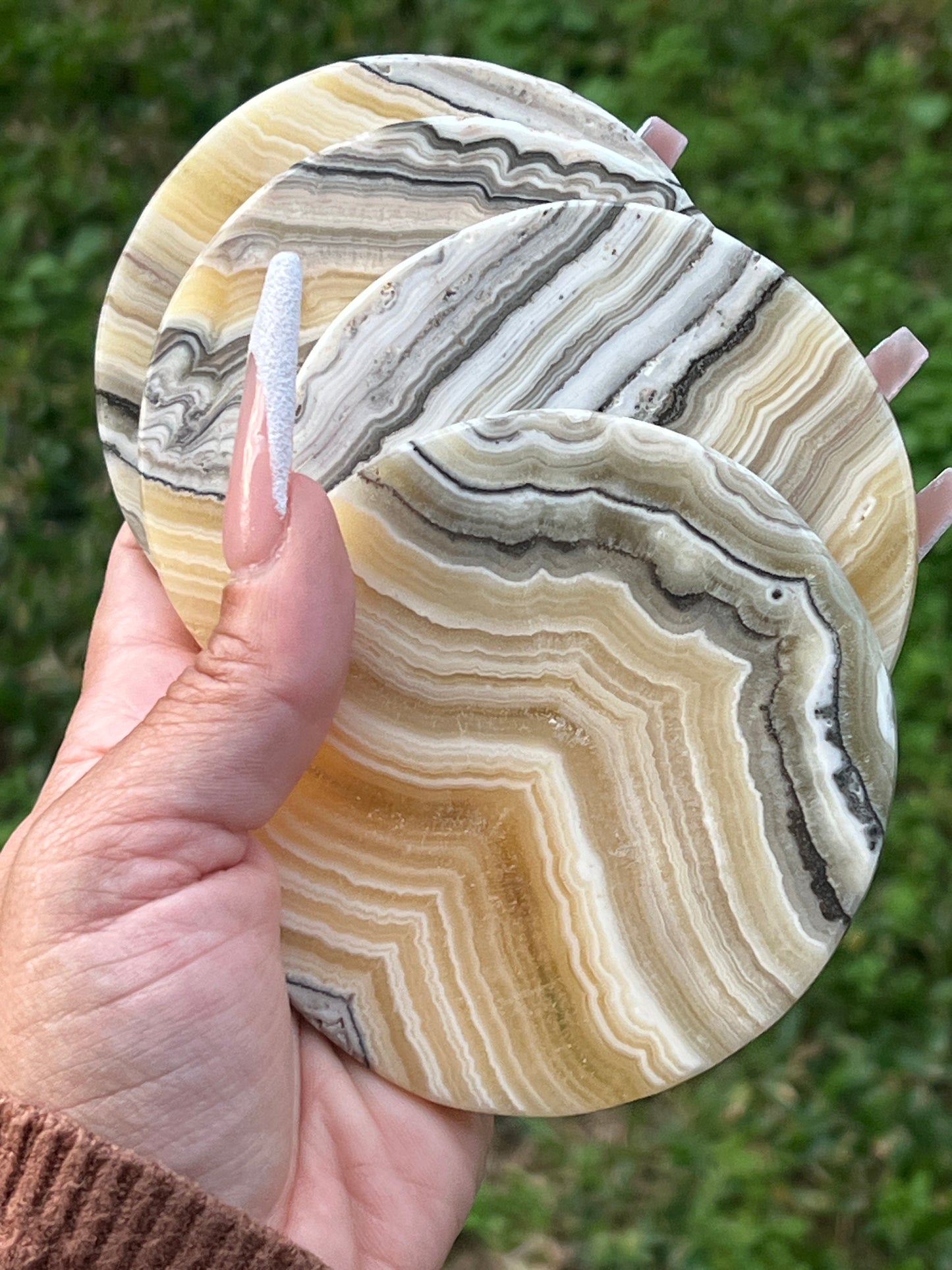 What a lovely set of juicy Calcite Coasters! This set of four coasters carries properties of joy and creativity!