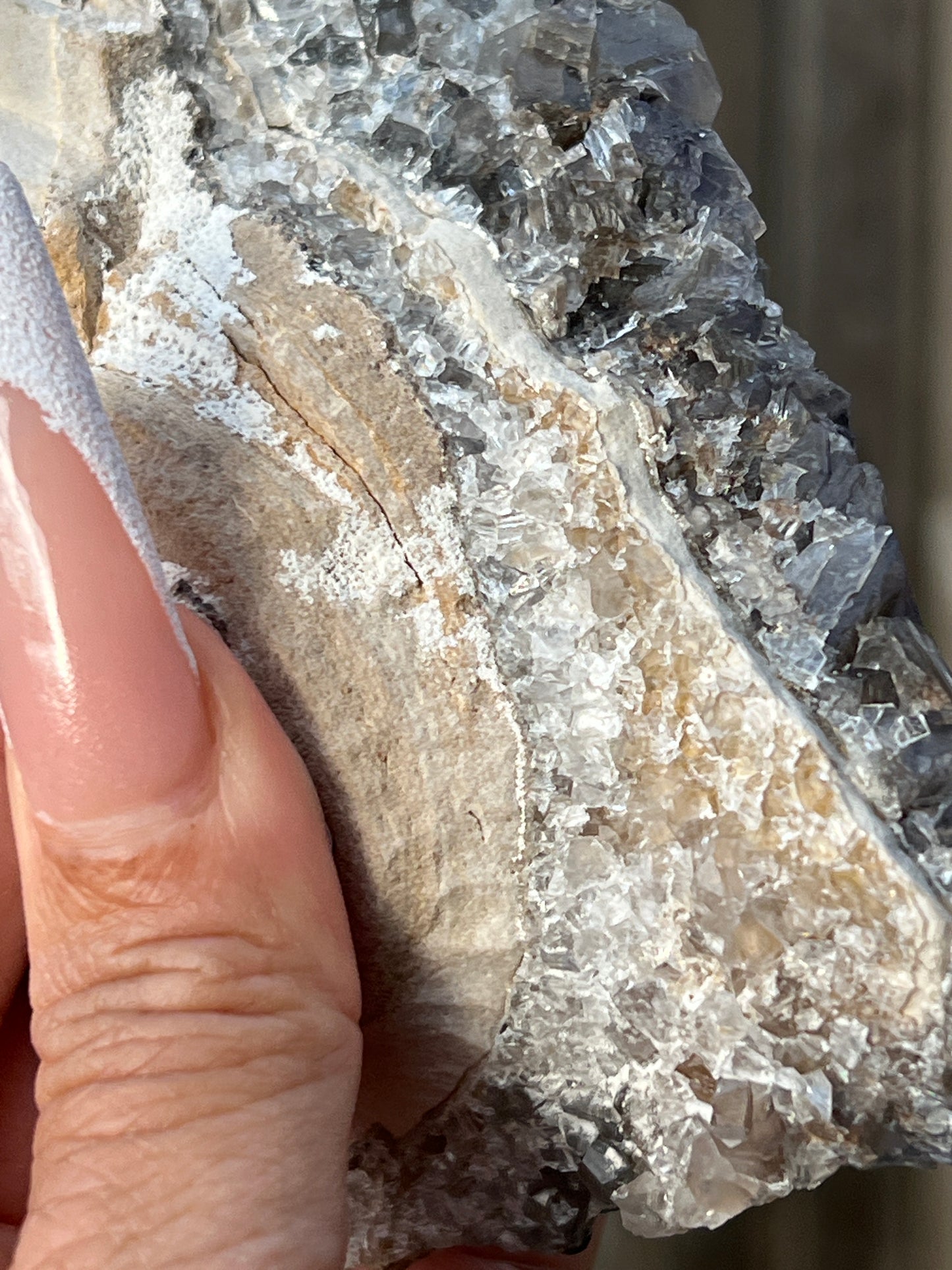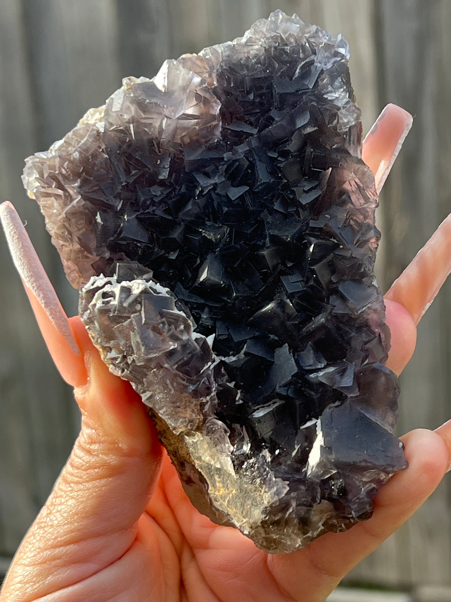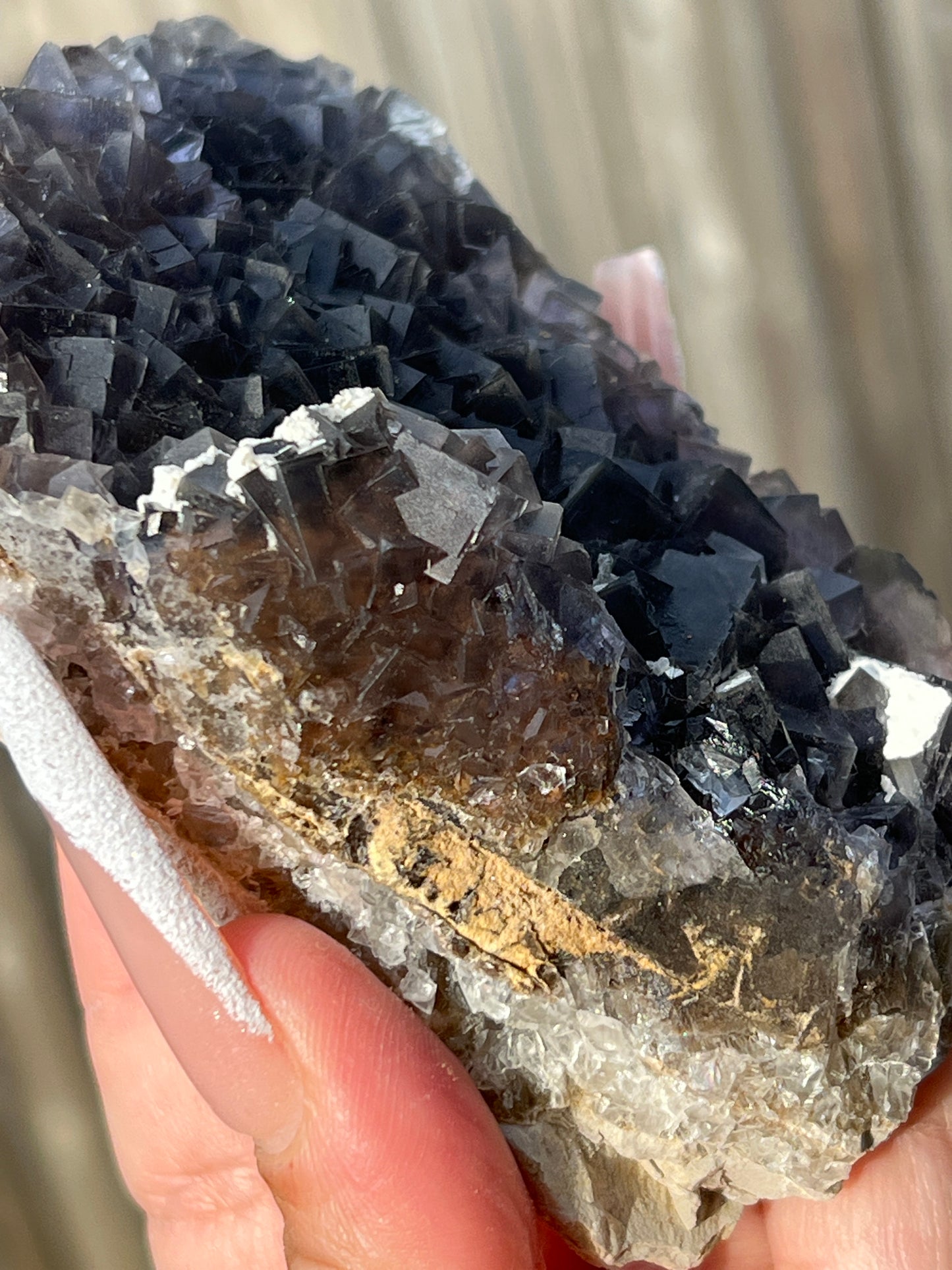 Similarly to Anhui Fluorite, with the packed and stacked cubes, this cluster has stacked cubic formation and a deep cool-tone with calcite encrusted around the matrix!
