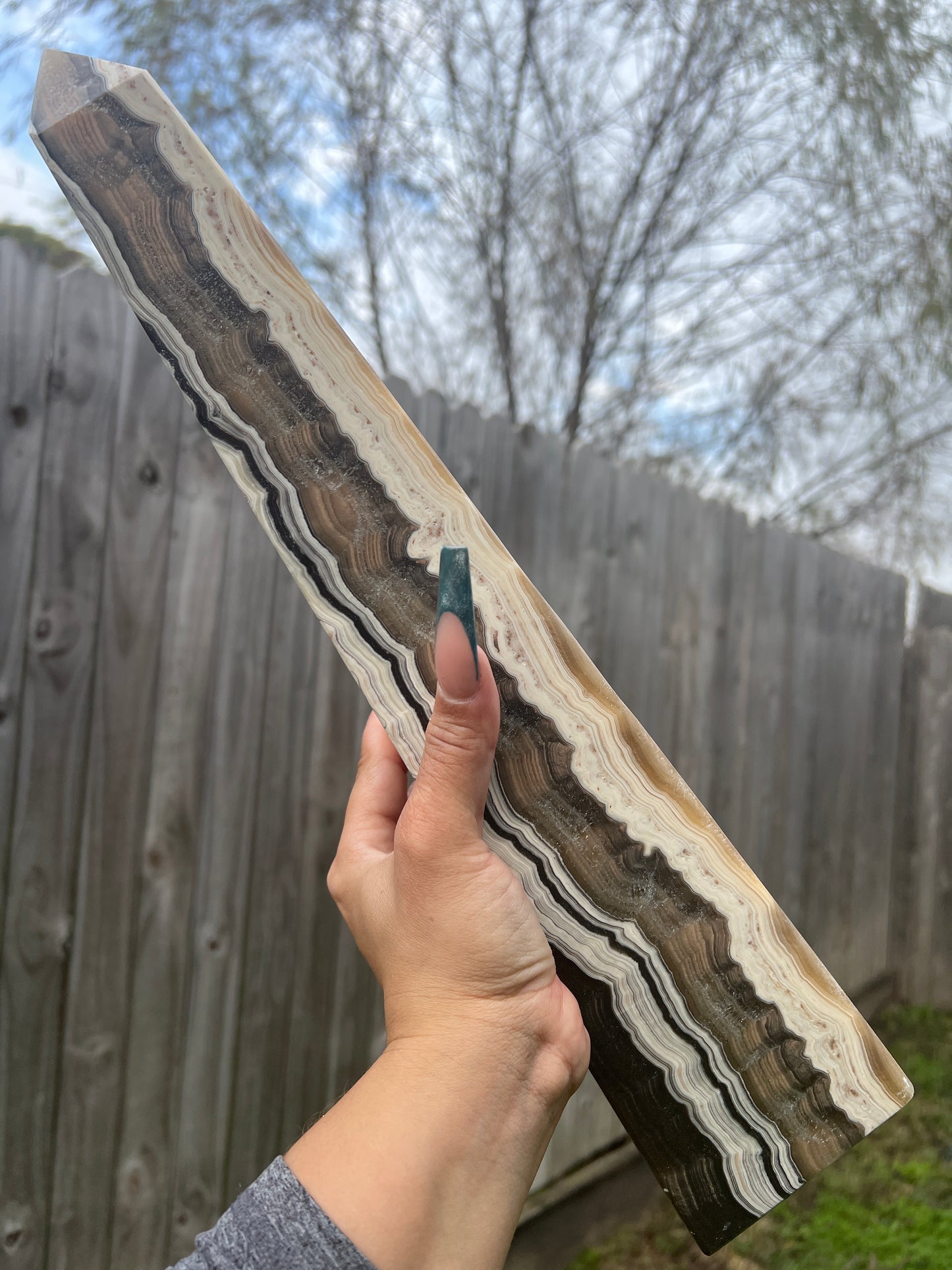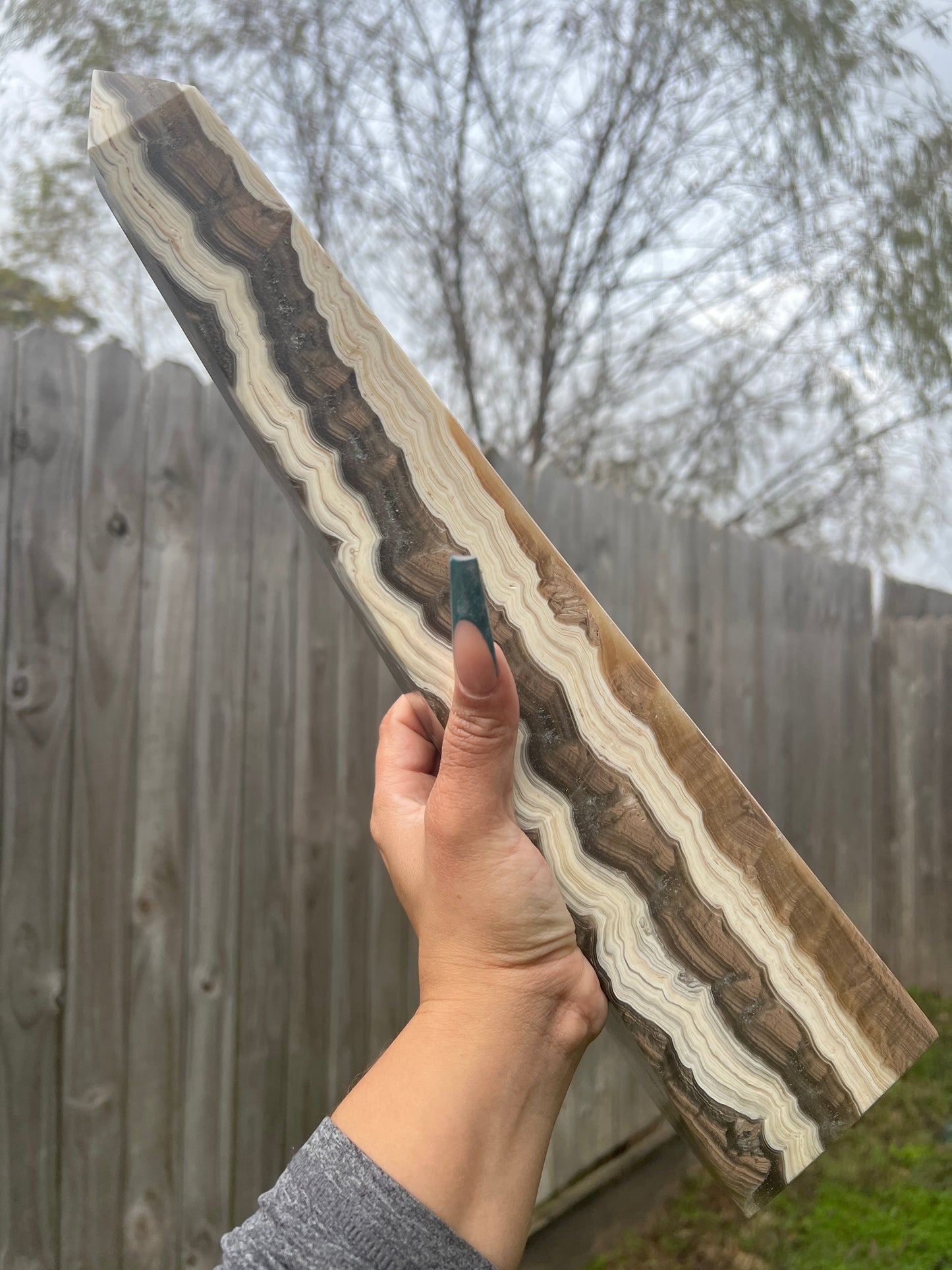 These gorgeous, rich Brown Onyx Towers comes from Mexico. Exceptionally intricate banding in creams and browns swirl around each side of these unique 16 inch statement tower.