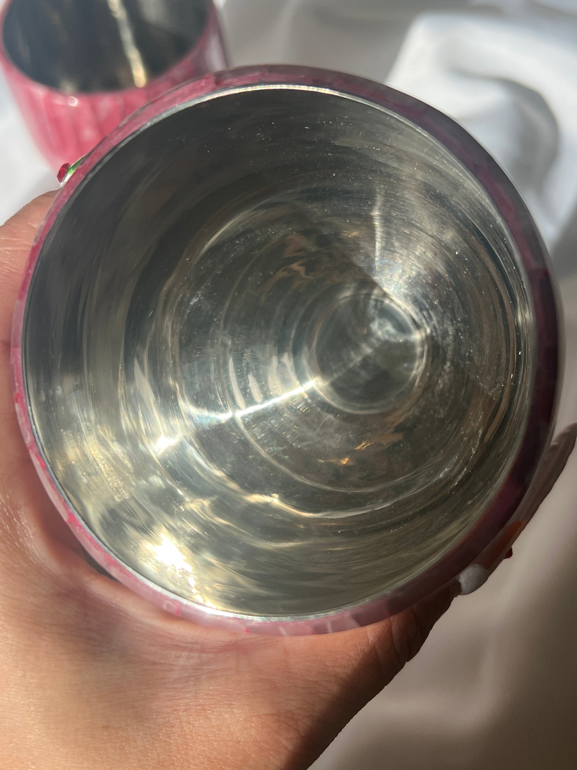 These vibrant and unique mosaic-style goblets are handmade and constructed using individually cut and polished Mangano Calcite tiles, which have been carefully glued onto a stainless steel base with a punchy pink adhesive! ***These cups are drink-safe!***