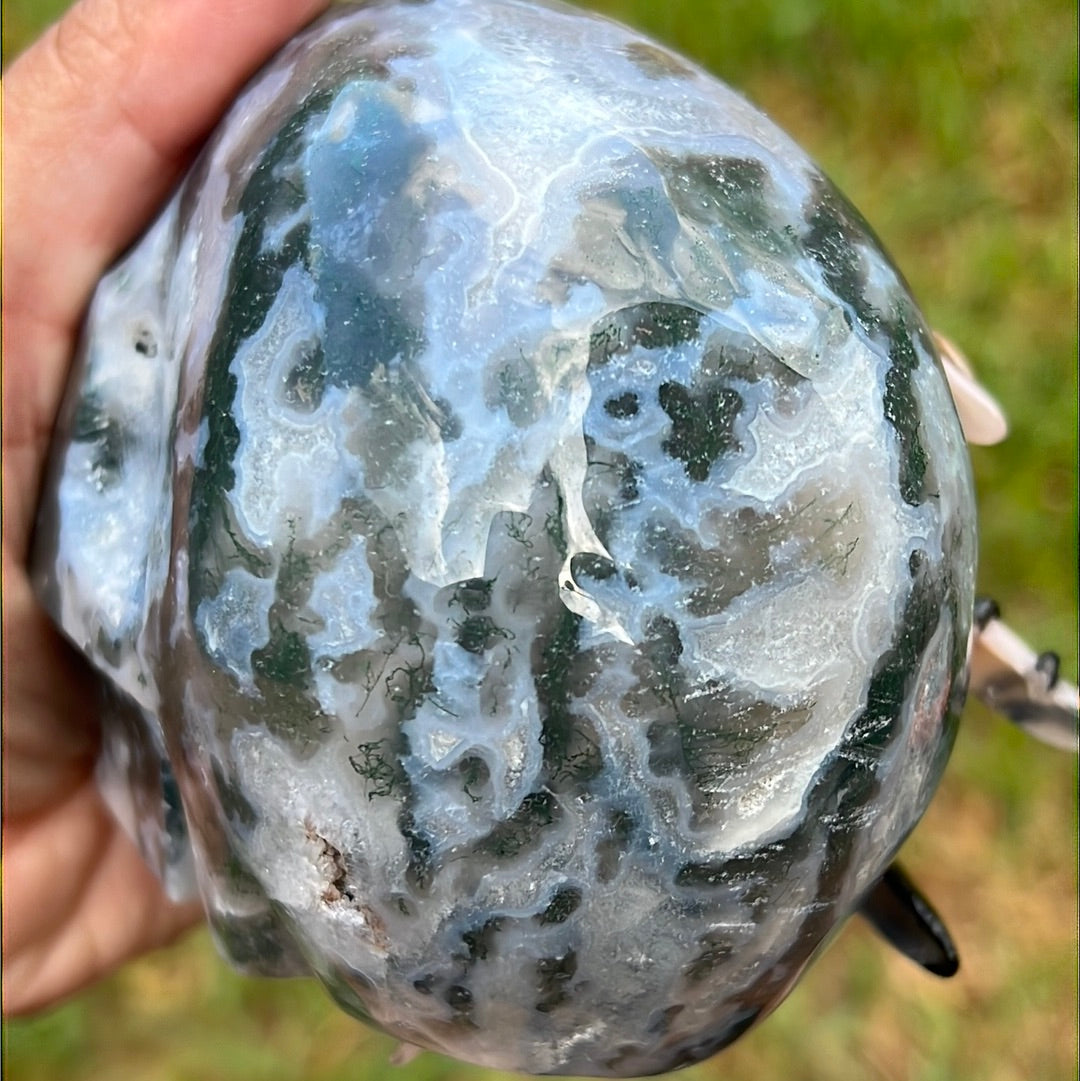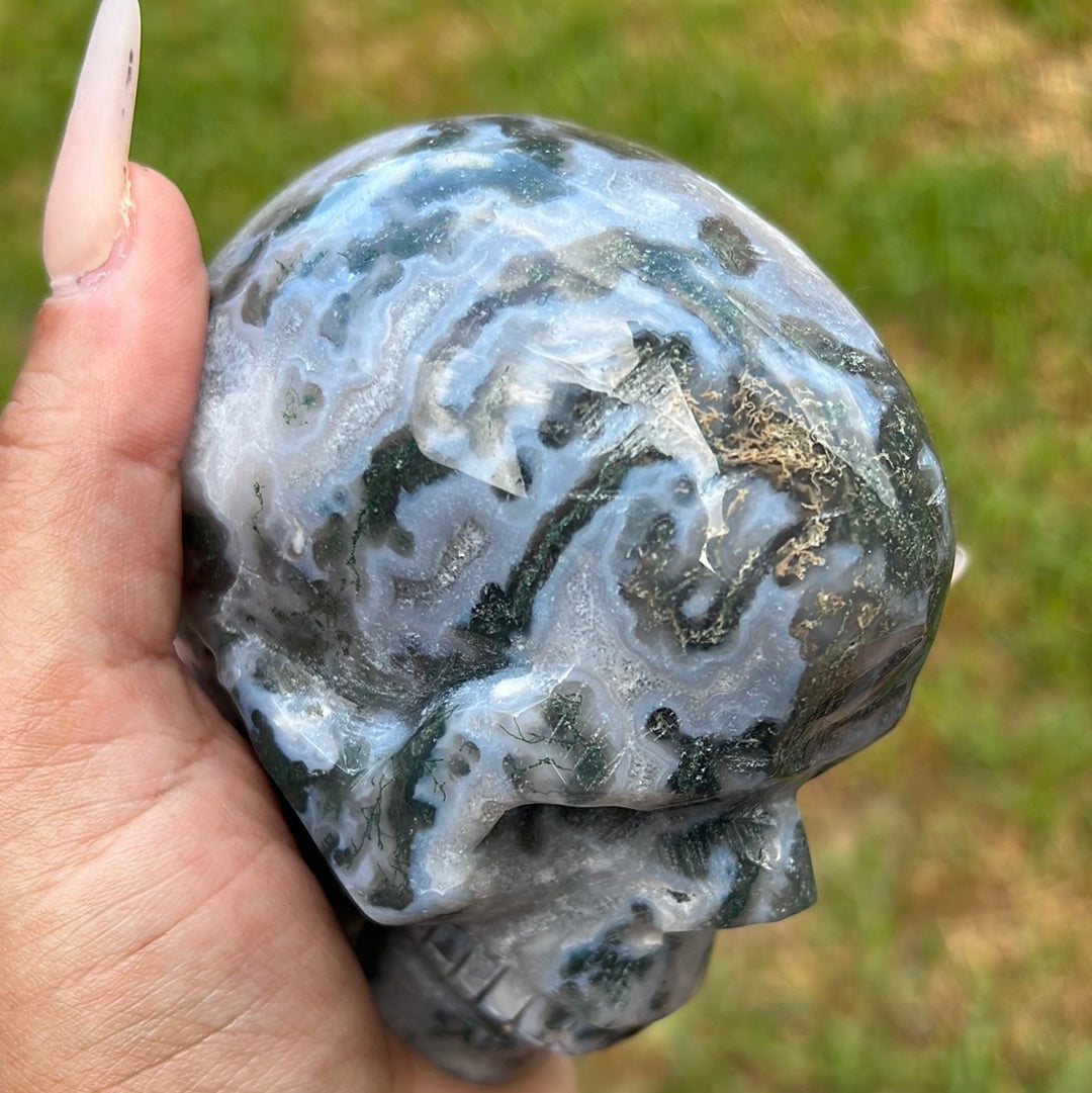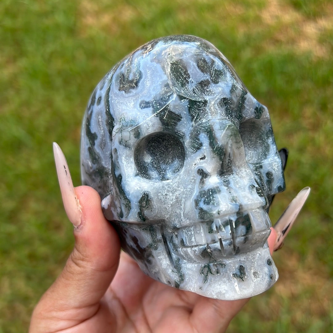 “Unearthed Wonders” Moss Agate Skull