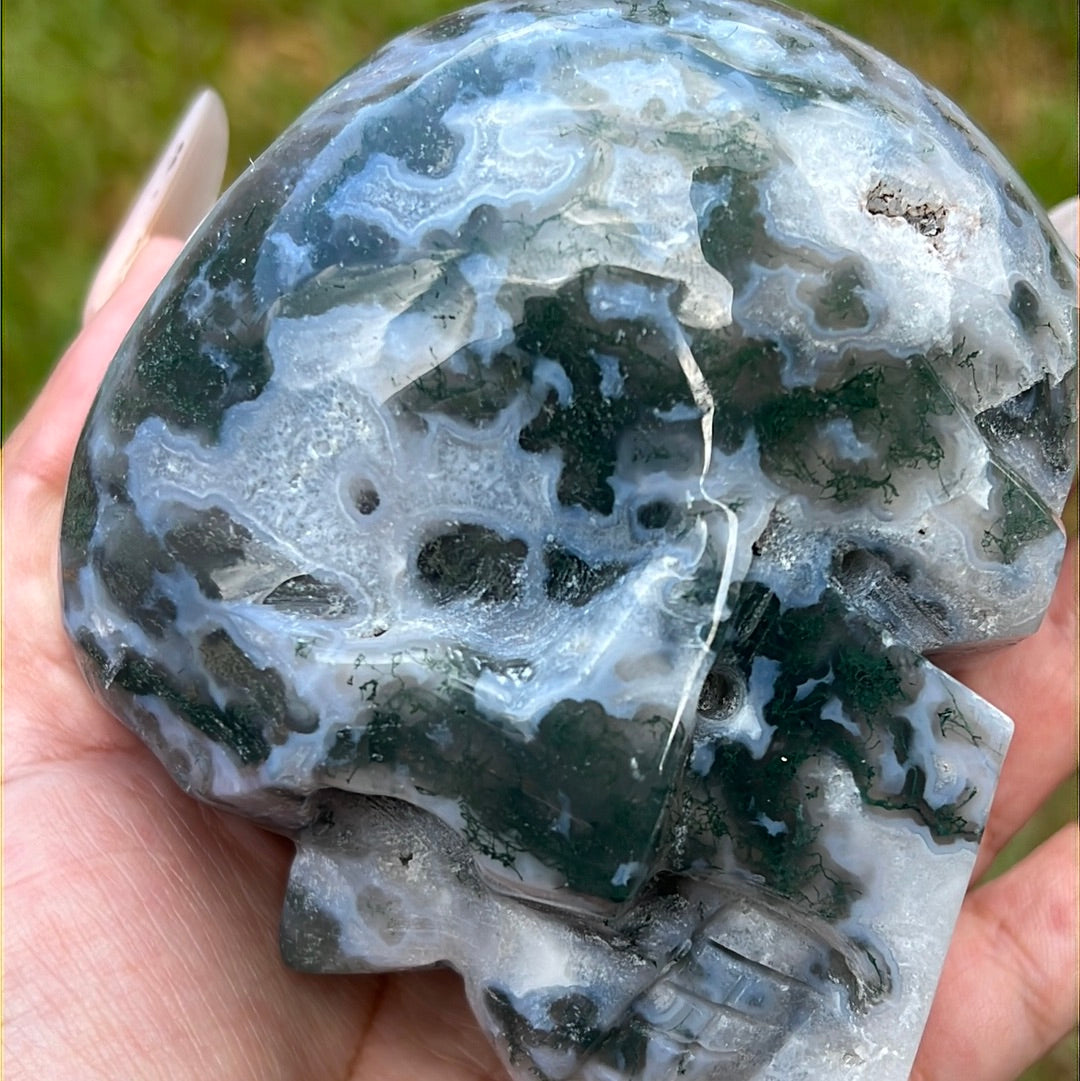 A gorgeous moss agate skull with vibrant green and autumnal moss-like inclusions! Blue chalcedony rivers run through sparkling quartz pockets!